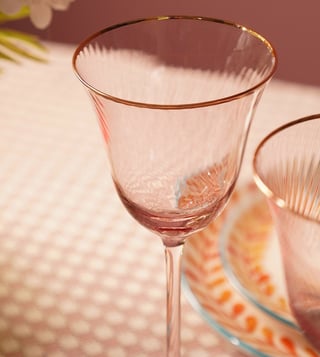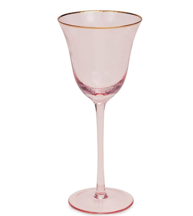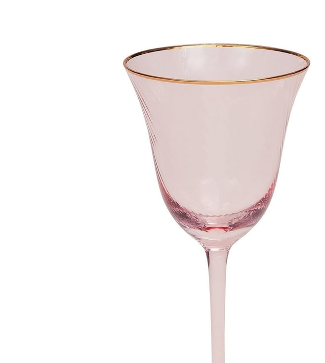 Add a swirl of charm to your table with these pink spiral textured wine glasses, elegant, fun and perfect for every sip. Features a gold rim. Elevated with spiral textures. Made of soda-lime. Comes in a set of 2. Made in China.