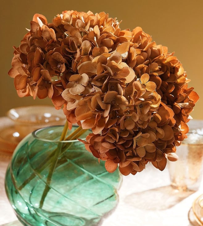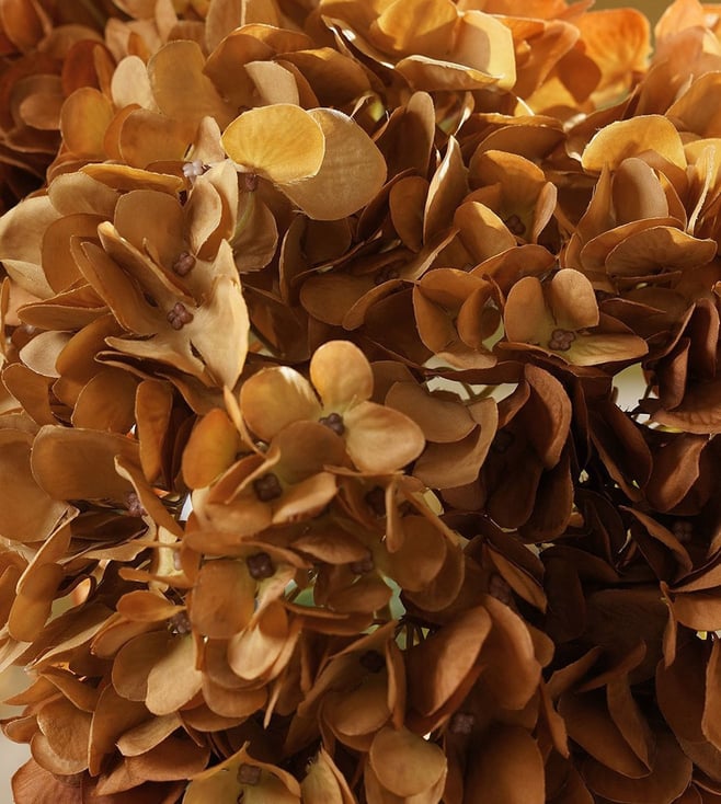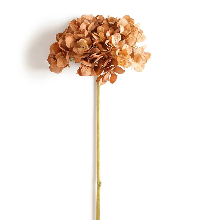 With a remarkably realistic feel and texture, this brown hydrangea dry artificial stem will bring a natural appeal to table arrangements, vases and more. Style it individually in a slim vase or as part of a bold arrangement. Realistic feel. Easy to clean. Made in China.
