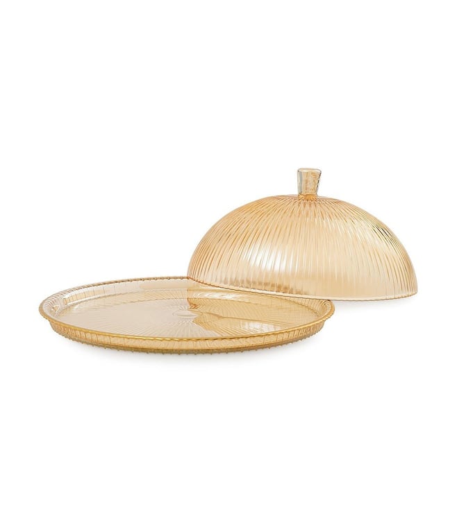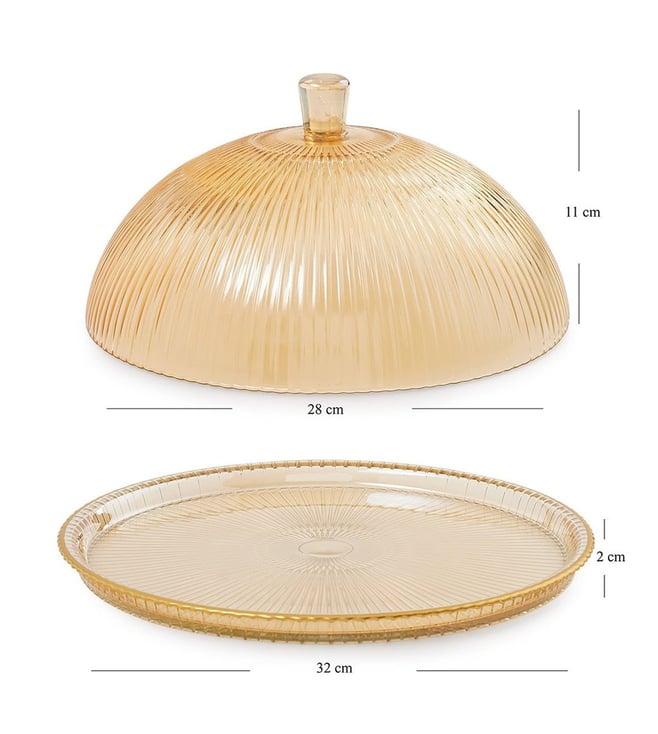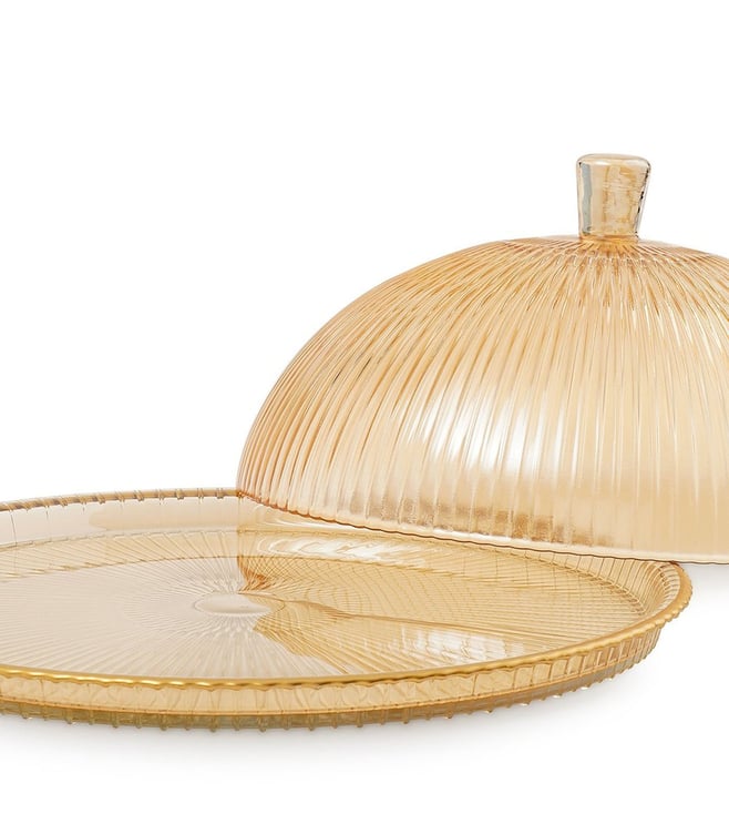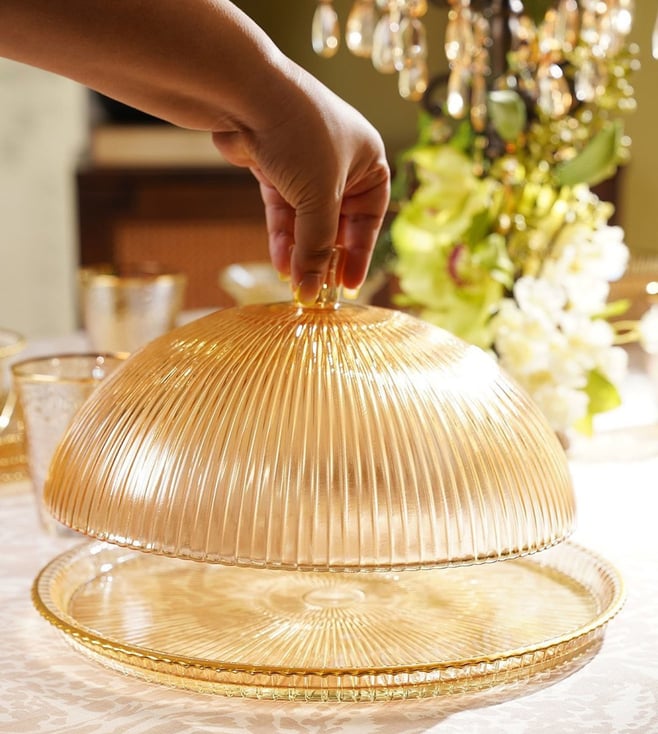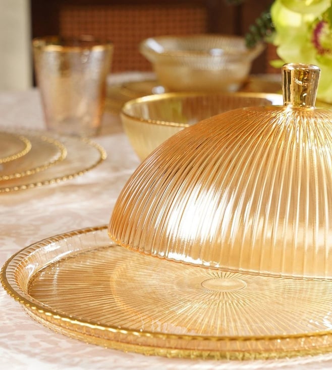 Perfect for your sweet delicacies, serve your cakes in style with this exquisite ribbed glass cloche. Features ribbed texture. Comes with gold rim detailing. With a convenient handle. Made of glass. Made in Turkey.