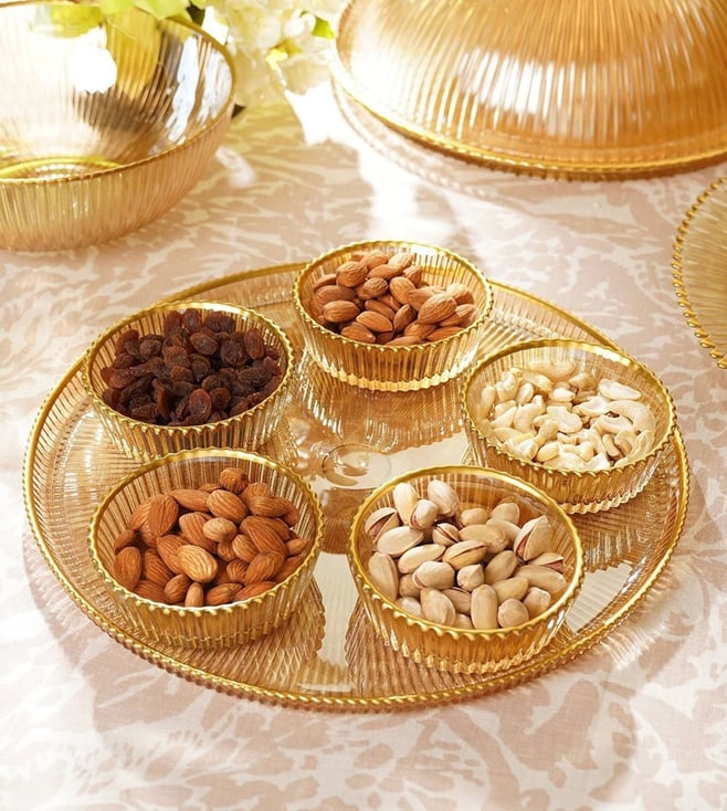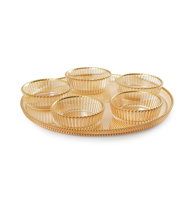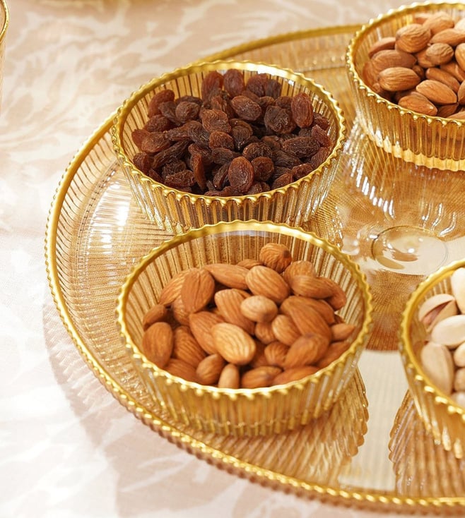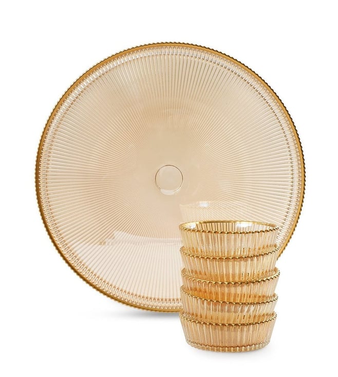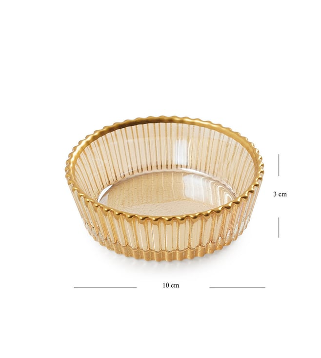 Crafted with an elegant ribbed texture, this set of bowls and a serving plate combines functionality and aesthetics. Features gold rim detailing. With exquisite gold rim. Crafted meticulously in ribbed texture. Made of Glass. Made in Turkey.