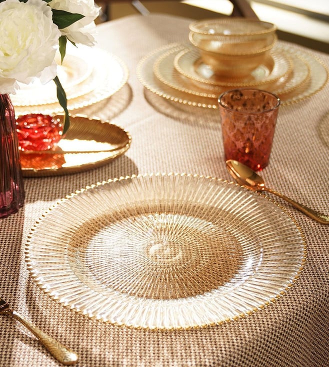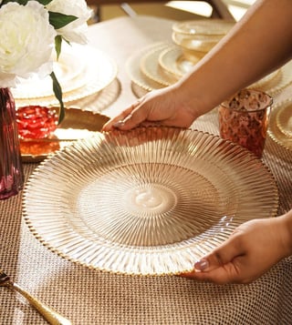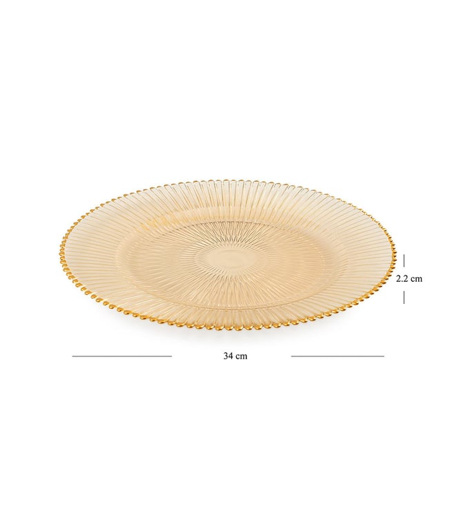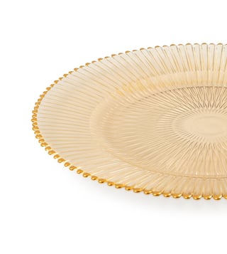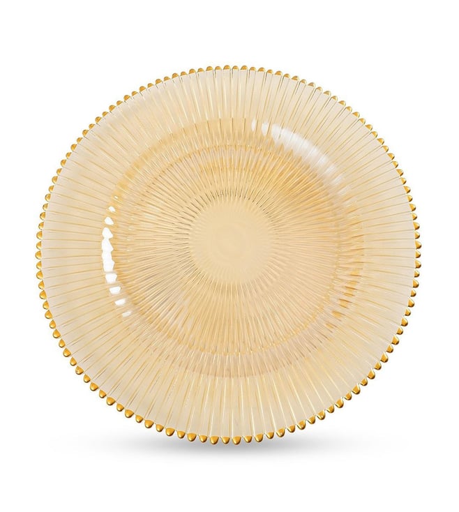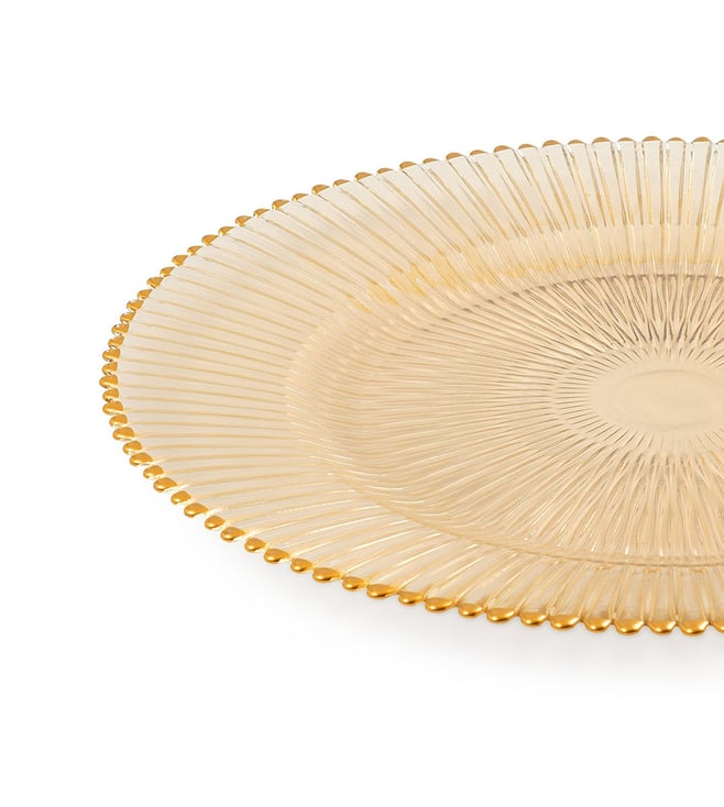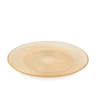 These amber and gold ribbed charger plates are a classic piece to own and cherish. Perfect to pair with any dinnerware, these blend simplicity and splendour to bring you a timeless design to cherish for years to come. Ribbed details. Gold rim detail. Made of glass. Made in Turkey. Comes in a set of 2.