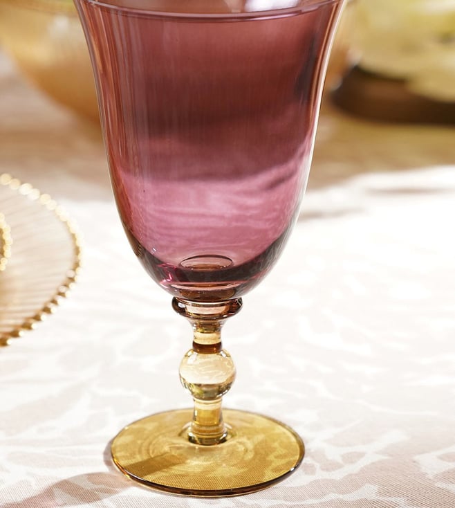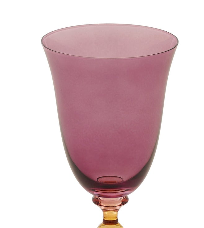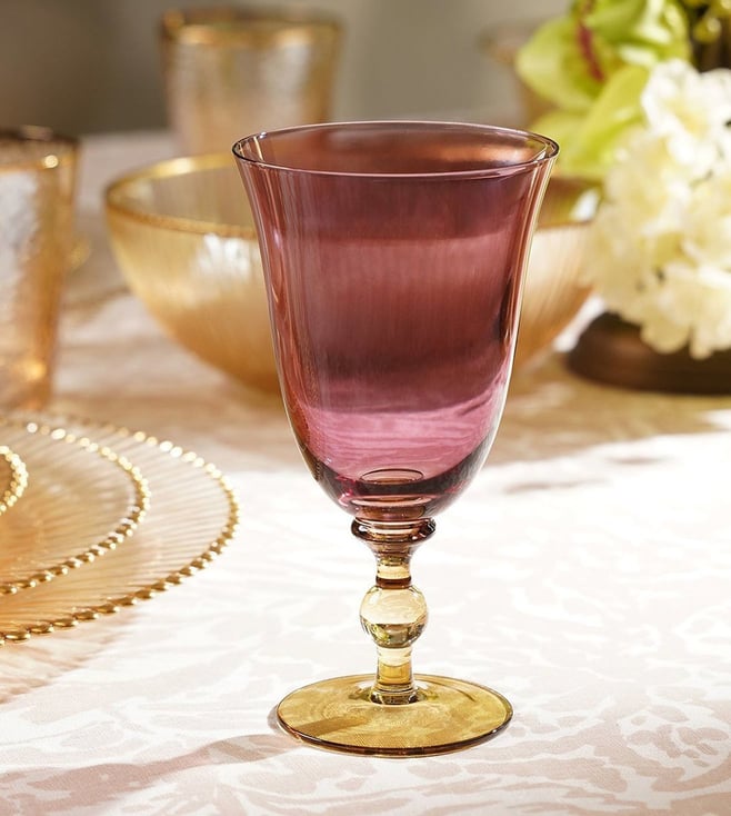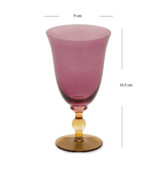 Elevate your wine-tasting experience with these stylish and sophisticated glasses. The graceful blend of amber and burgundy, coupled with a subtle ribbed texture, transforms each glass into a work of art Ribbed-like texture. Sleek stem for a comfortable hold. Made of glass. Made in China. Comes in a set of 2.