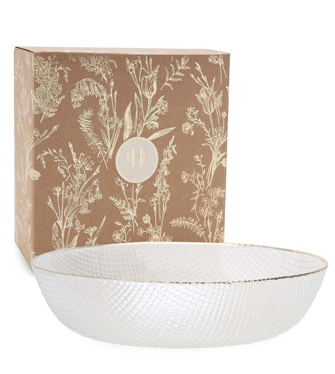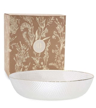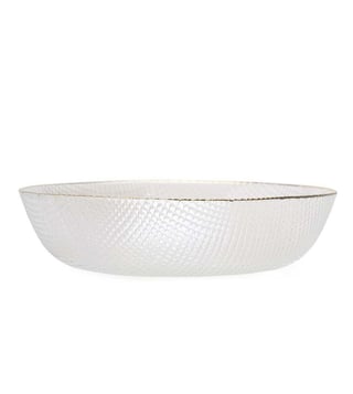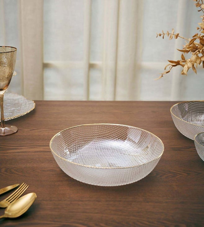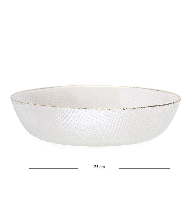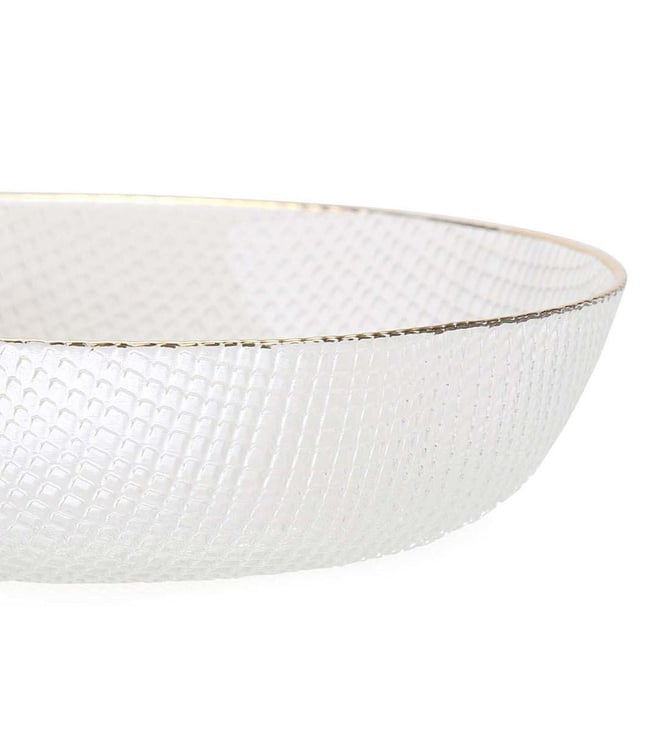 Featuring a 24 kt gold rim, this set of 1 fizz textured serving bowl from Pure Home and Living exudes a timeless charm. A classic piece to own and cherish, it will help elevate your tablescape and make for a functional and beautiful choice for your collection. It is made using glass.