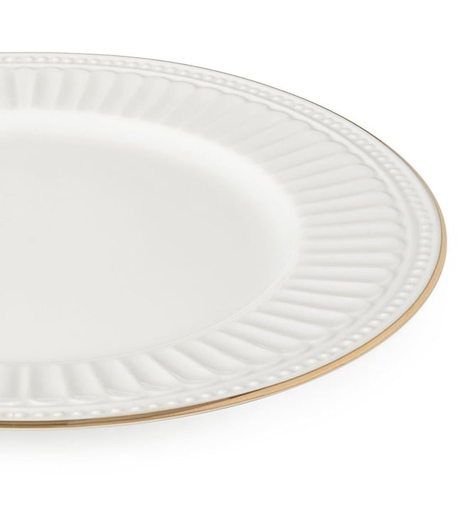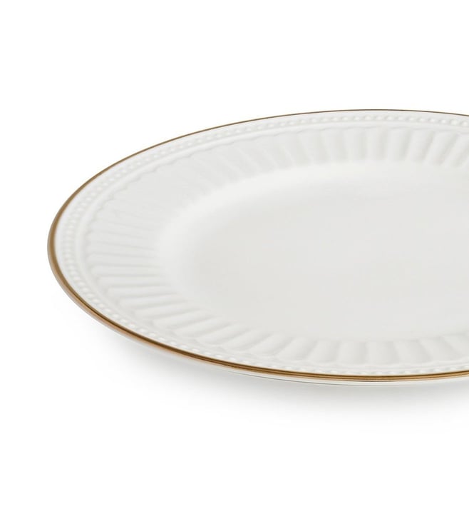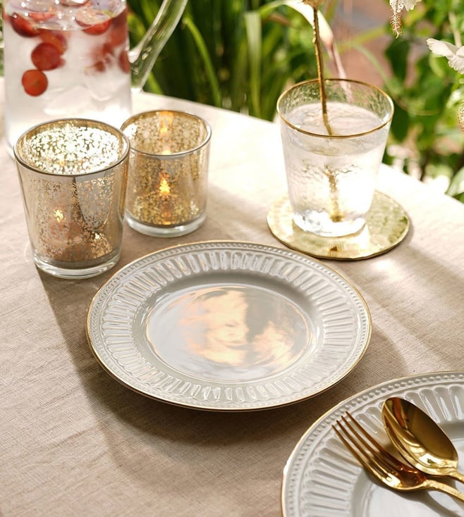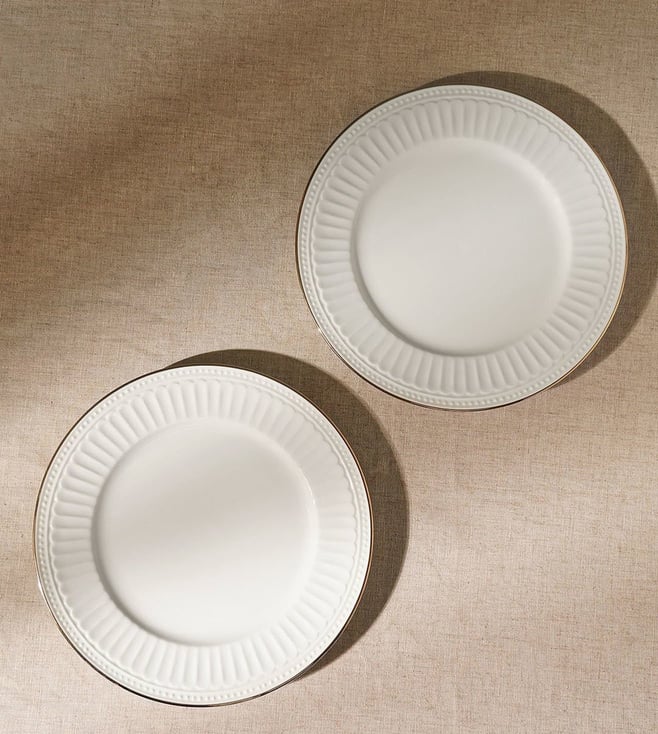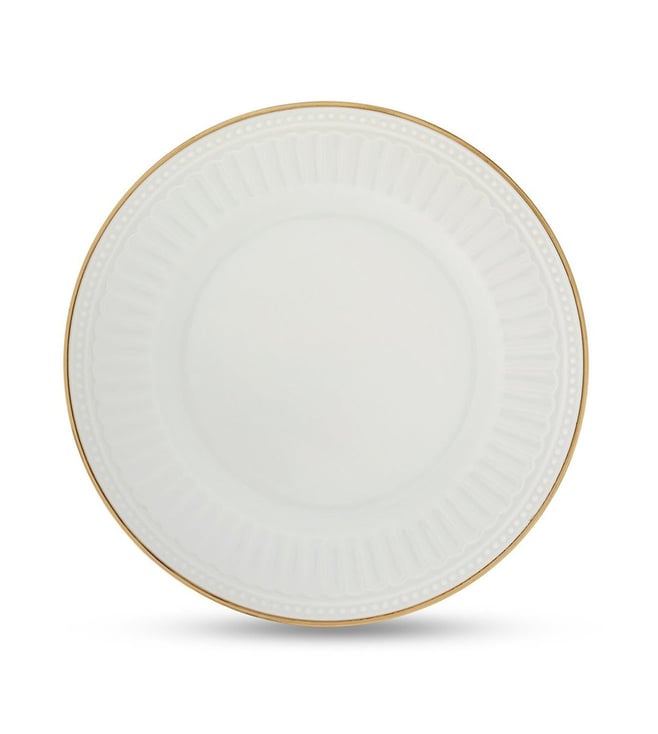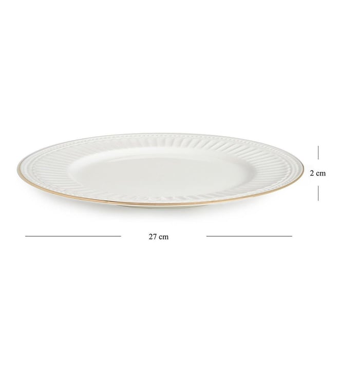 Add a touch of elegance to your dining experience with Pure Home and Living White Ceramic Dessert Plates. Perfect for special occasions like New Year, Diwali, Mother's Day, Wedding, Birthday, and Anniversary. Made with ceramic, featuring a real gold rim.'Disclaimer: All other items in the image are only for display purposes and will not be a part of the delivery content. Product colour may slightly vary due to photographic lighting sources. Country of Origin - India.