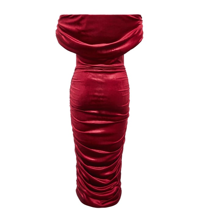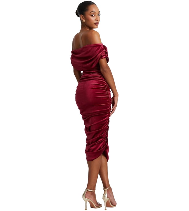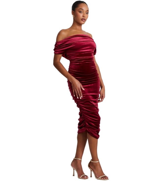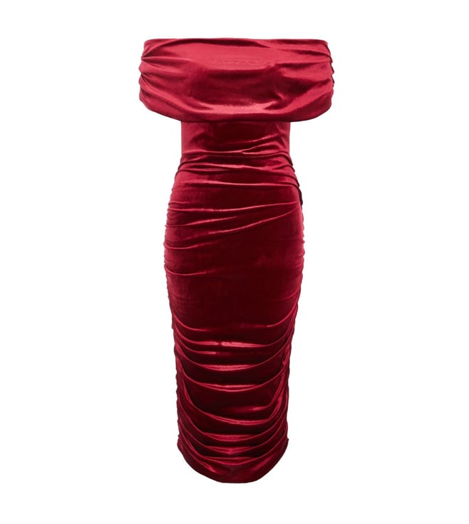 Pump up your style quotient with this red off-shoulder regular fit dress from Quiz. Tailored to sartorial perfection from premium quality fabric, it assures a soft and soothing touch against the skin. Exuding short sleeves, it is sure to fetch you compliments from all.