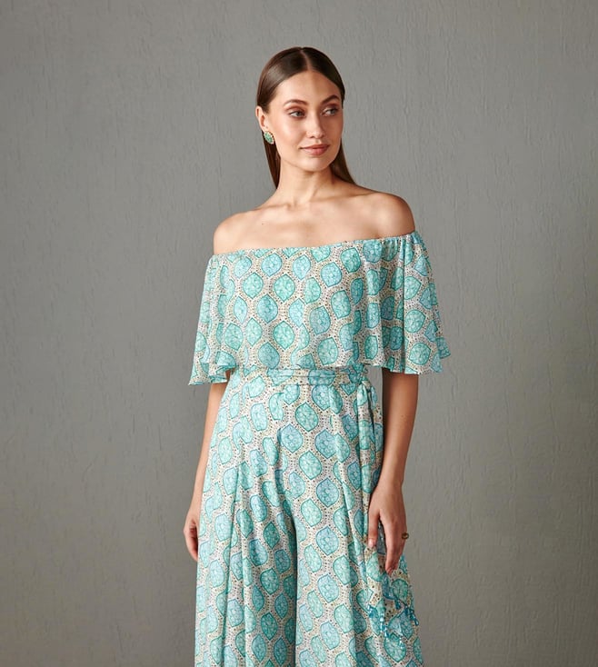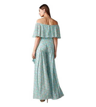Rabani & Rakha Aqua Taj Booti Print Adha Jumpsuit with Cape