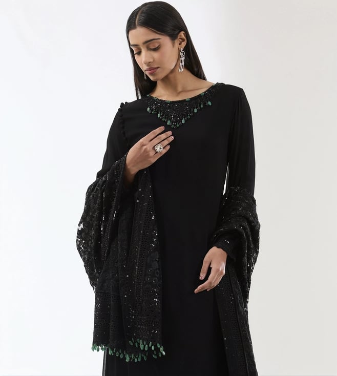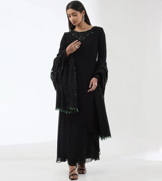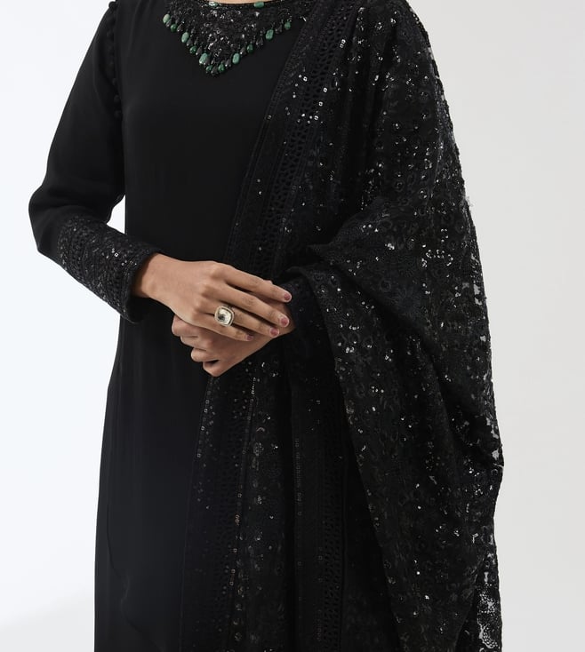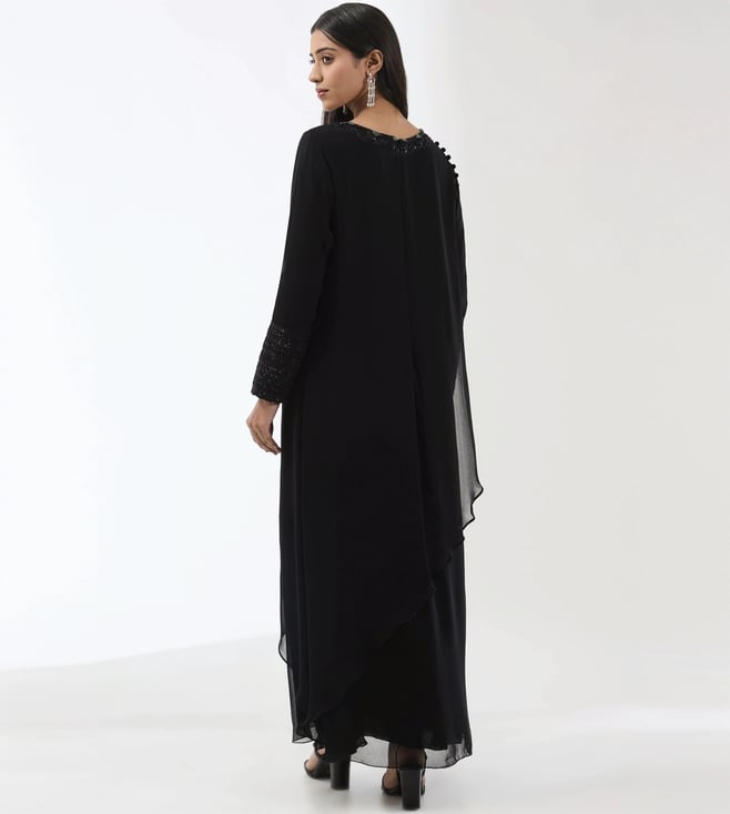 Rabani & Rakha Black Ayat Gorgette 2 Layer Long Kurta With Dupatta And Pant