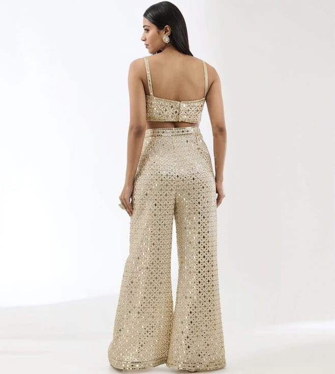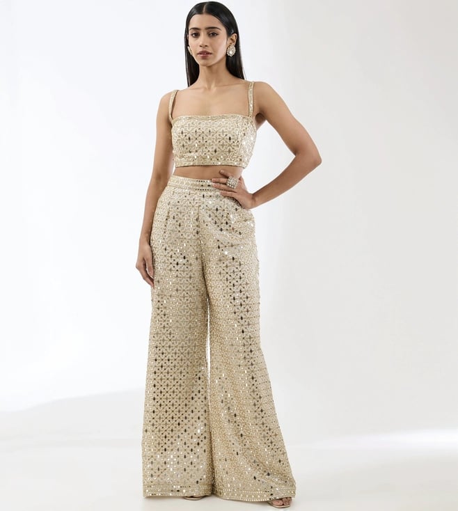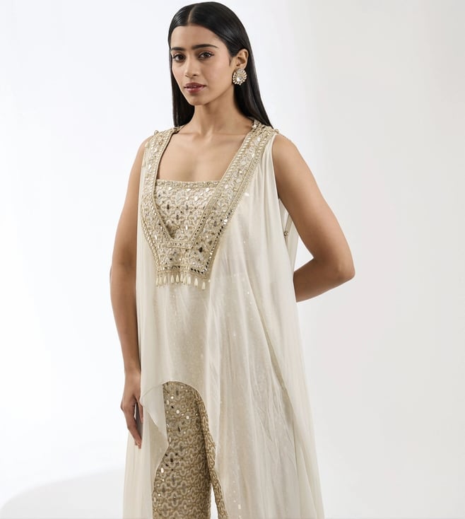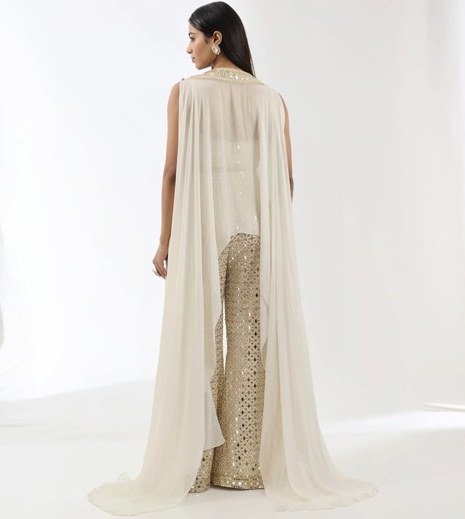 Rabani & Rakha Ivory Rabia Zari Sequin Mirror Gorgette Pallazo And Blouse With Cape Set