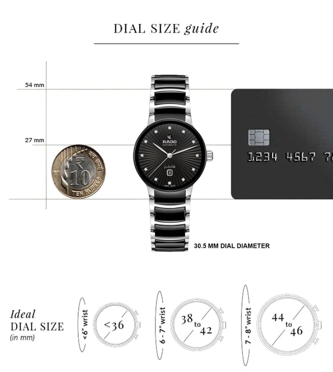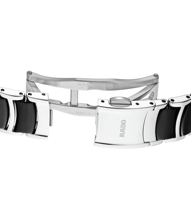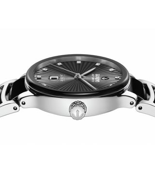 The classic Centrix Automatic Diamonds watch has been reworked not only technically, but also aesthetically. The modified model has a rounded sapphire crystal that extends all the way to the edge, as well as a curved case blending with the curved crystal edge. The adjusted case lugs and the bracelet made of polished stainless steel with black high-tech ceramic middle links complete the overall appearance of this iconic timepiece. The black sunray dial with 12 diamonds, emphasised with the printed "jubile" logo, matches perfectly with the rhodium-coloured hands.
