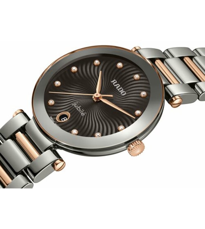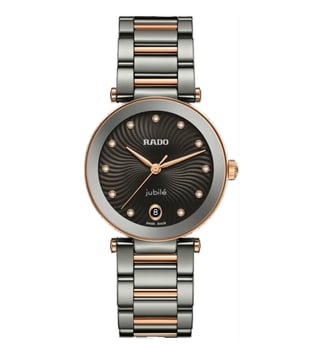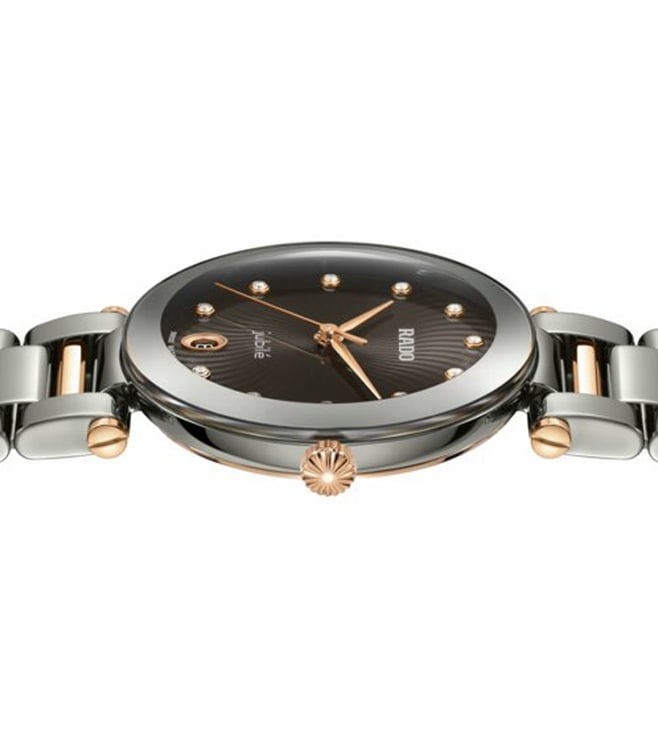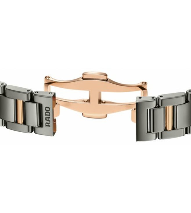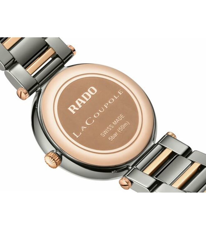 LaCoupole stands as a tribute to the icons of yesterday, redefined for today¿s sophisticated wearer. An expression of refined glamour, engineered with the precision and innovation only Rado can offer. Its 31 mm monobloc case in polished plasma high-tech ceramic is crowned by a domed sapphire crystal, elevated by a grey & rose gold coloured metallised border. The case is water-resistant to 5 bar (50 metres), uniting everyday resilience with enduring elegance. The result is a silhouette that is unmistakably Rado sleek, sculptural, and timeless.