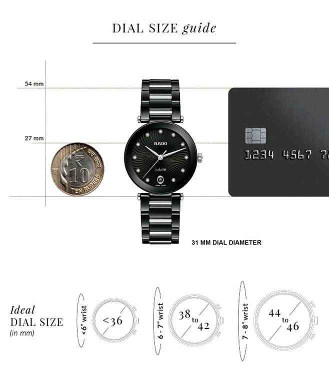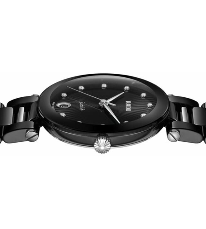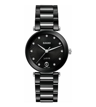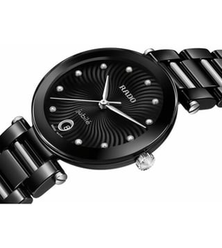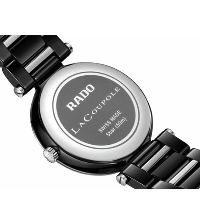 LaCoupole stands as a tribute to the icons of yesterday, redefined for today¿s sophisticated wearer. An expression of refined glamour, engineered with the precision and innovation only Rado can offer. Its 31 mm monobloc case in polished black high-tech ceramic is crowned by a domed sapphire crystal, elevated by a black & silver coloured metallised border. The case is water-resistant to 5 bar (50 metres), uniting everyday resilience with enduring elegance. The result is a silhouette that is unmistakably Rado sleek, sculptural, and timeless.