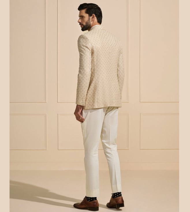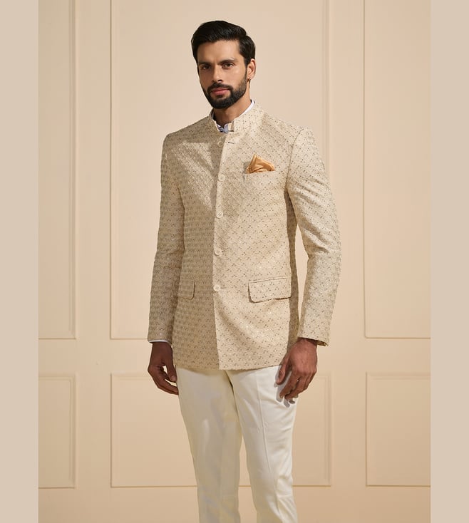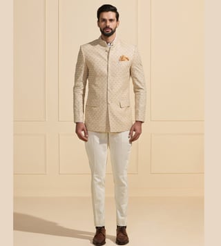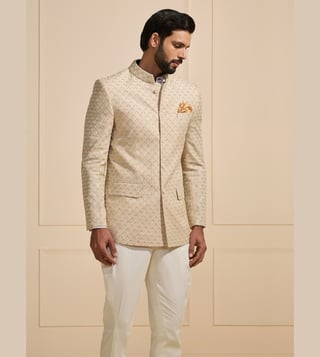 Crafted with delicate, small-scale patterns that add texture without overwhelming, this bandhgala piece exudes an understated elegance. The flap pockets introduce a functional yet stylish element, enhancing its modern appeal. Its neutral tone makes it a versatile wardrobe essential, suitable for weddings, receptions, or cultural festivities.
