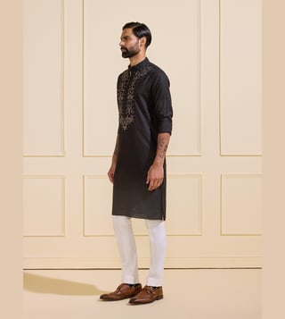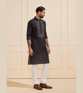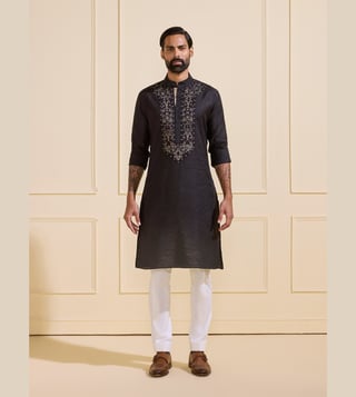 Unveil timeless elegance with this black kurta, where rich, deep hues meet luxurious detailing. The sleek black fabric serves as the perfect canvas for the golden design delicately embroidered around the placket, adding an air of regal sophistication. The ornate accents makes it ideal for weddings, festive gatherings, or grand occasions.
