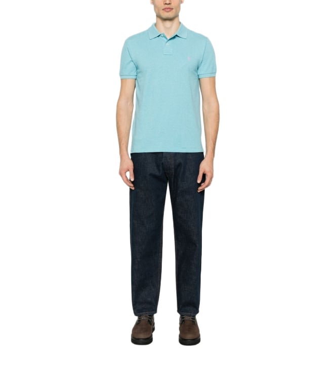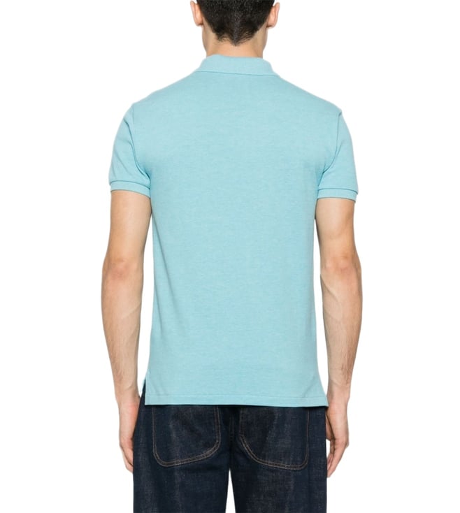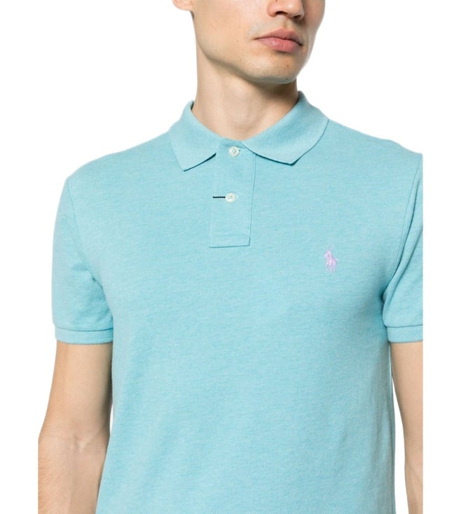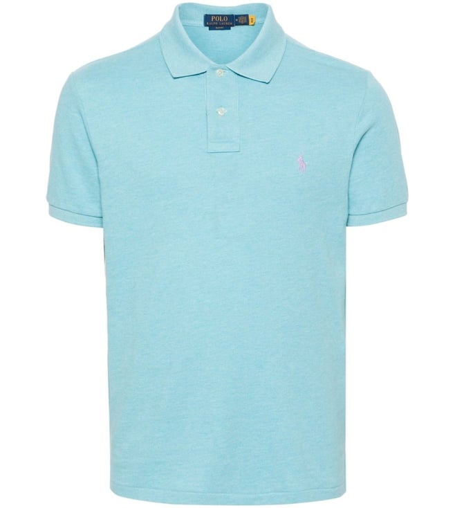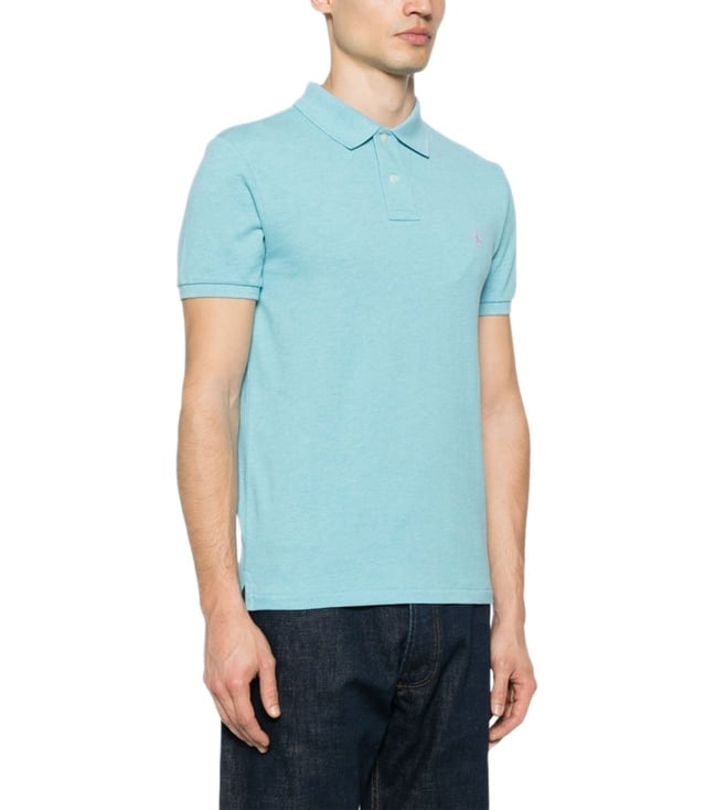 Elevate your style with the Ralph Lauren Aqua polo t-shirt. Sky blue cotton weave polo collar embroidered signature polo pony motif short sleeves short side slits straight hem short front button fastening.