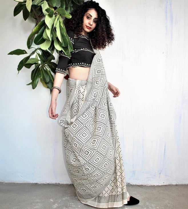 Black & White Geometrical Printed Off-Shoulder Crop Top with High Slit Skirt