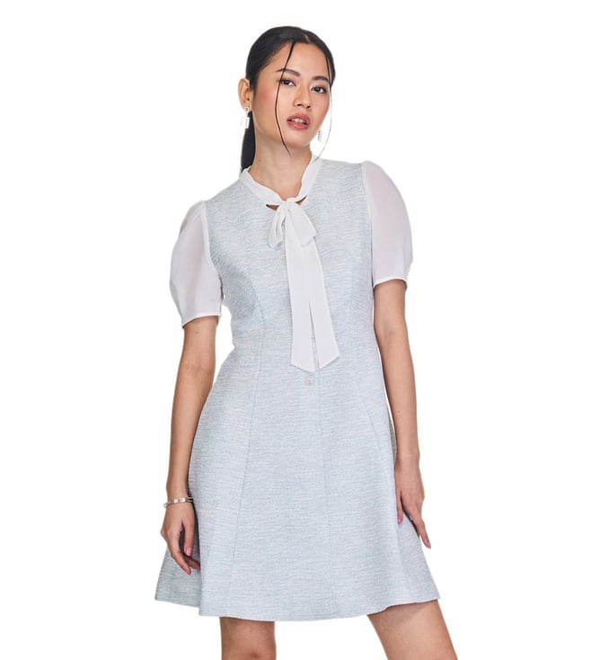 Blue Regular Fit Tweed Mini Dress with Neck Tie
