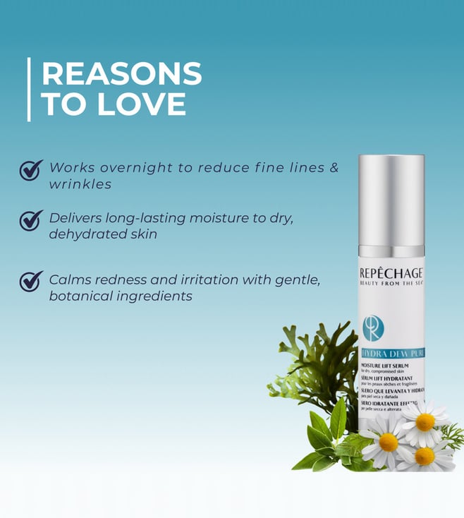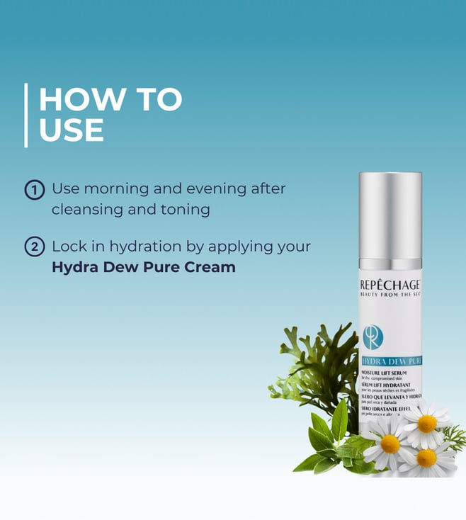 The hydra dew pure moisture lift serum combines advanced hydration tech with botanical and marine actives to bring about smoother, firmer and radiant skin. Whether you're battling environmental stress, dryness or early fine lines, this serum delivers an instantly comforting and visibly rejuvenating boost-making it an essential for a refined, healthy glow. It reduces fine lines and wrinkles, supports firmness and elasticity through marine based actives. Also soothes redness and reactivates dull, tight skin, making it ideal for dry, compromised, mature or sensitive skin.