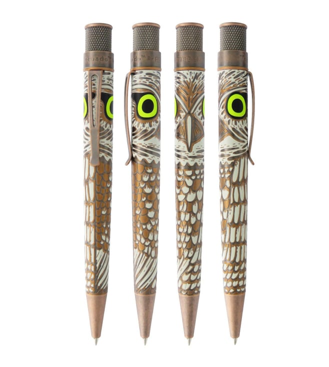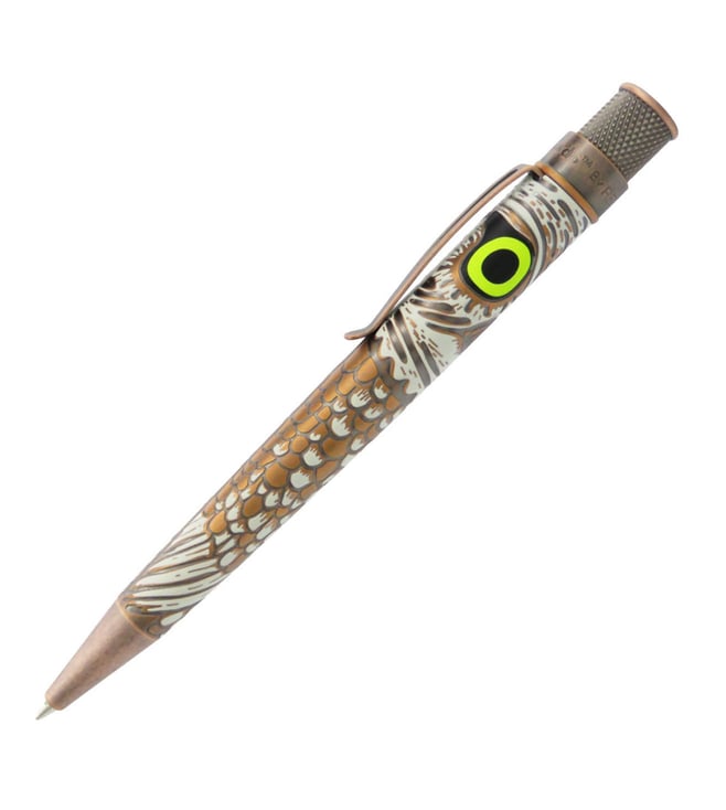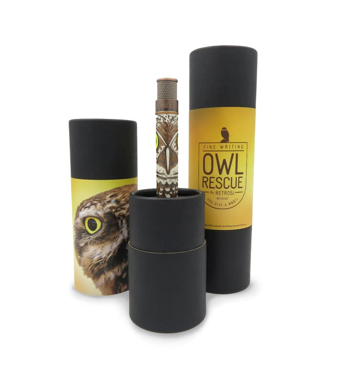Owl Rescue Tornado Ballpoint with acid-etched barrel, copper-plated finish, and glow-in-the-dark owl eyes. Supports Blackland Prairie Raptor Center. Packaged with a sleeve and notebook, perfect for bird lovers.