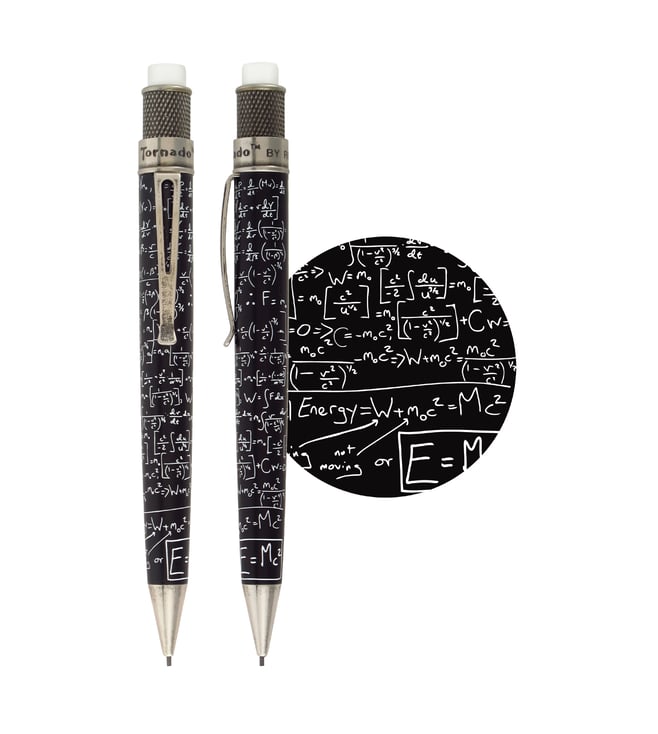 The Albert pencil features a matte black lacquer finish over stainless steel, accented with stonewashed trim, and Einstein's equations written in white. The most recognized one being the mass-energy equivalence equation: E=mc2. These 1.15mm pencils operate with a simple twist of the top, plus there is a a huge eraser on top for those who make an occasional mistake. Each pencil comes packaged in a graphic tube with extra lead and erasers.