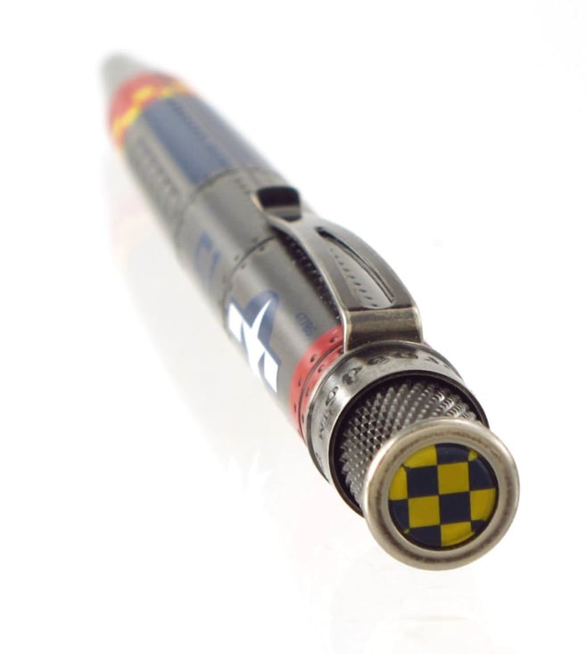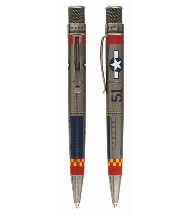 P-51 Mustang Tornado Rollerball, inspired by Tuskegee Airmen¿s Red Tails. Acid-etched barrel with rivets, stonewash pewter finish, and red markings. Perfect for history and flight enthusiasts, packaged in a commemorative tube.