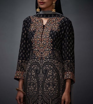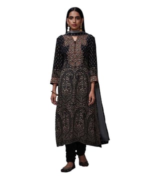 Achieve a magnetic look by wearing this black and beige kurta and churidar set with dupatta from Ri.Ritu Kumar. The set has been crafted with care from silk and crepe fabric and assures maximum comfort. The three-fourth sleeves, round neck and paisley print of the kurta add to its design. Match it with a pair of stilettos to complete the ensemble. Disclaimer: Product colour may slightly vary due to photographic lighting sources.