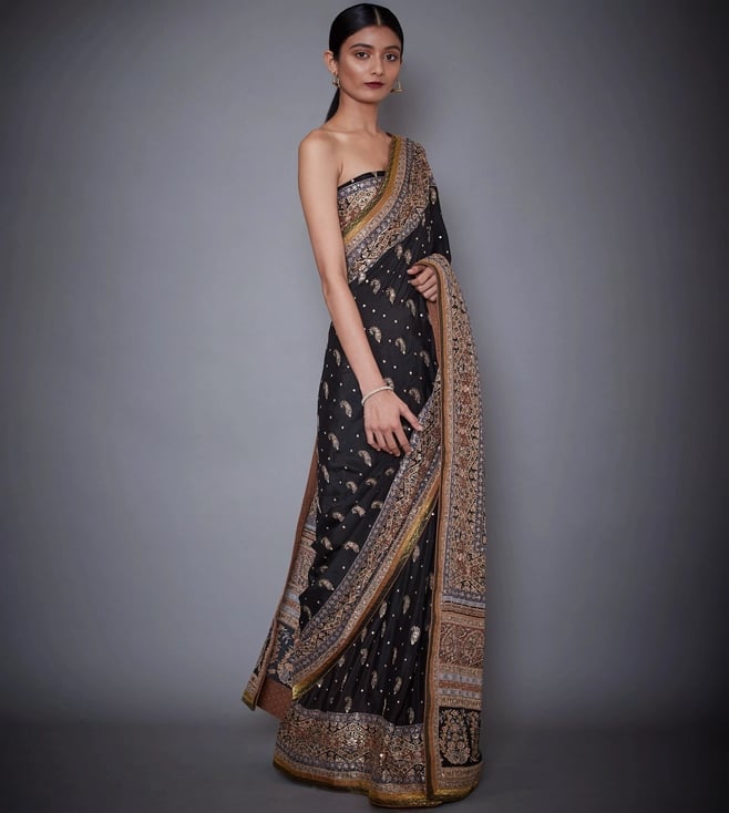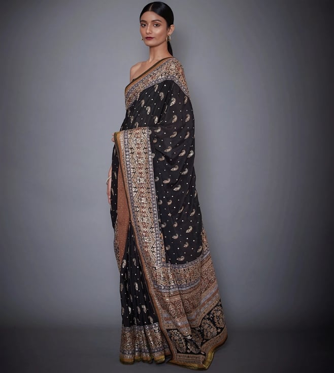 Achieve a splendid look by wearing this black and beige saree with unstitched blouse from RI.Ritu Kumar. The embroidery work makes it an alluring choice. Tailored to sartorial perfection, it is made of silk which ensures a soothing touch against the skin. Disclaimer : Product colour may slightly vary due to photographic lighting sources.