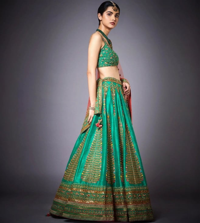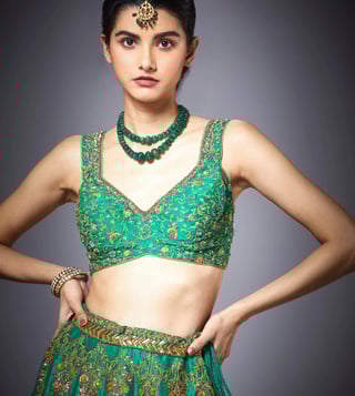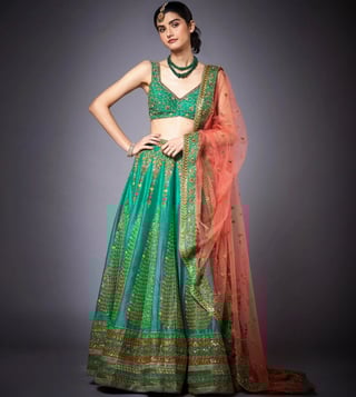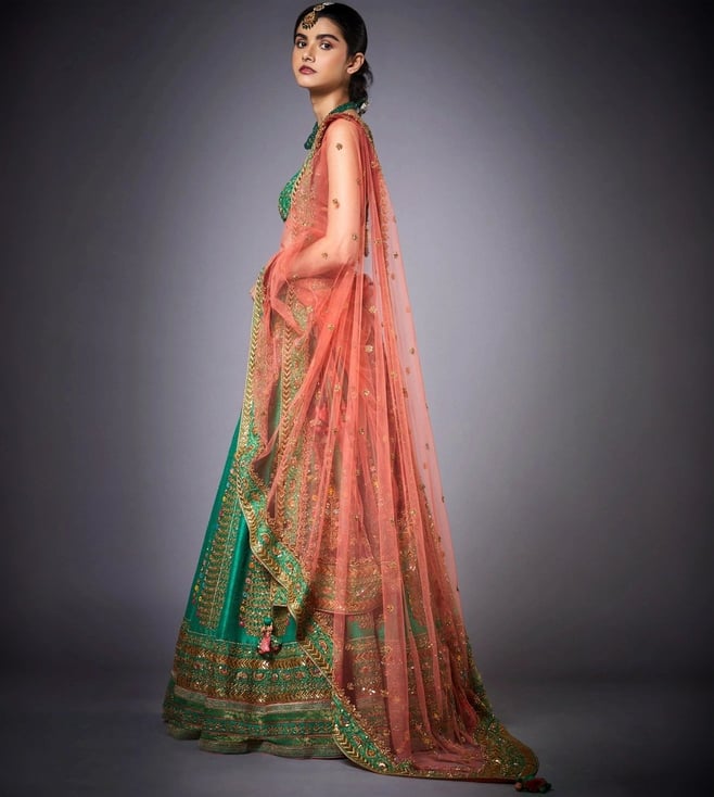 Forest Green & Peach Blouse With Lehenga And Dupatta