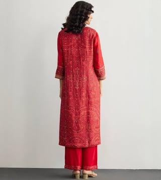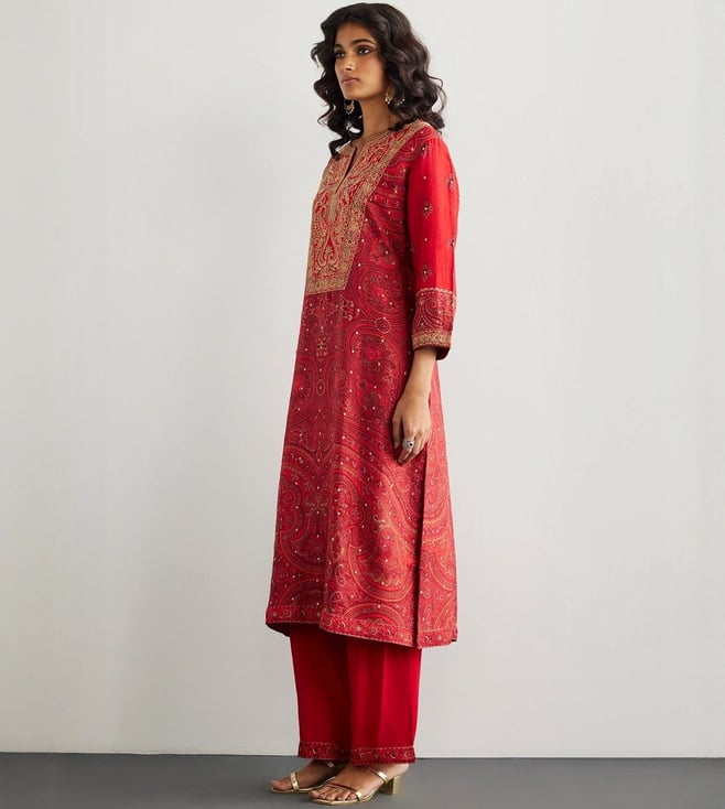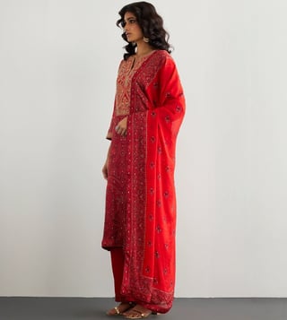 RI.Ritu Kumar Red & Beige Brocade Jamawar Kurta With Pant and Dupatta