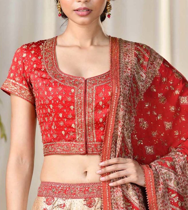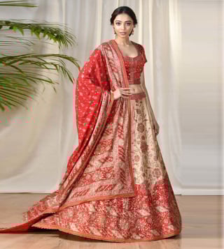 Let people appreciate you for your sense of style with this red and beige blouse and lehenga set with a dupatta from RI.Ritu Kumar. The short sleeves, round neck and embroidery work of the blouse add to its design. The embroidery work of the lehenga makes it an alluring choice. Team it with a pair of heeled sandals to complement the ensemble. The silk dupion used in its tailoring assures utmost comfort. Product colour may slightly vary due to photographic lighting sources.