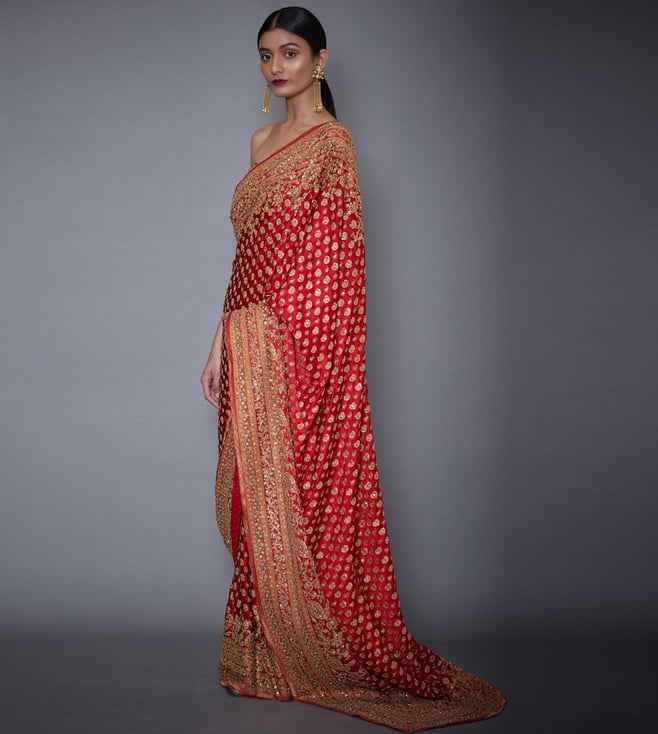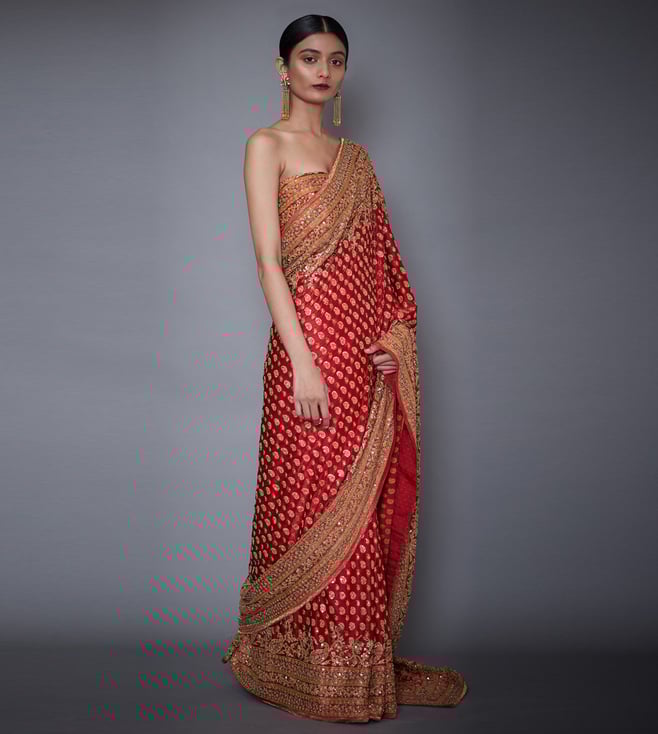 Amplify your look by wearing this red saree from RI.Ritu Kumar. The paisley print makes it a captivating choice. Tailored to sartorial perfection from silk chinon, it assures a soft and soothing touch against the skin. It also comes with an unstitched blouse piece. Disclaimer: The blouse in the image is only for display purposes and will not be a part of the delivery content.