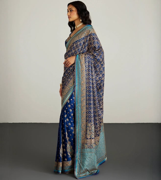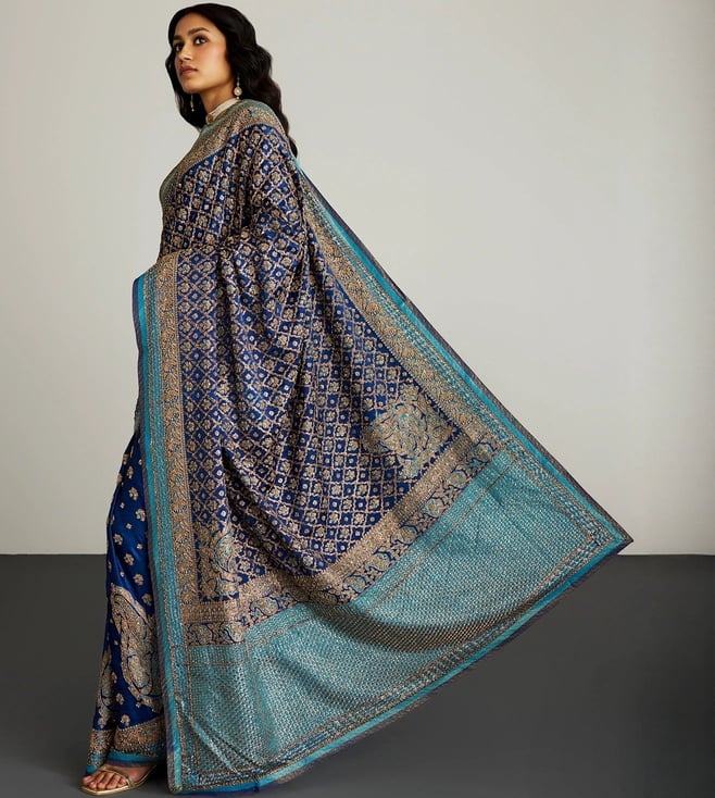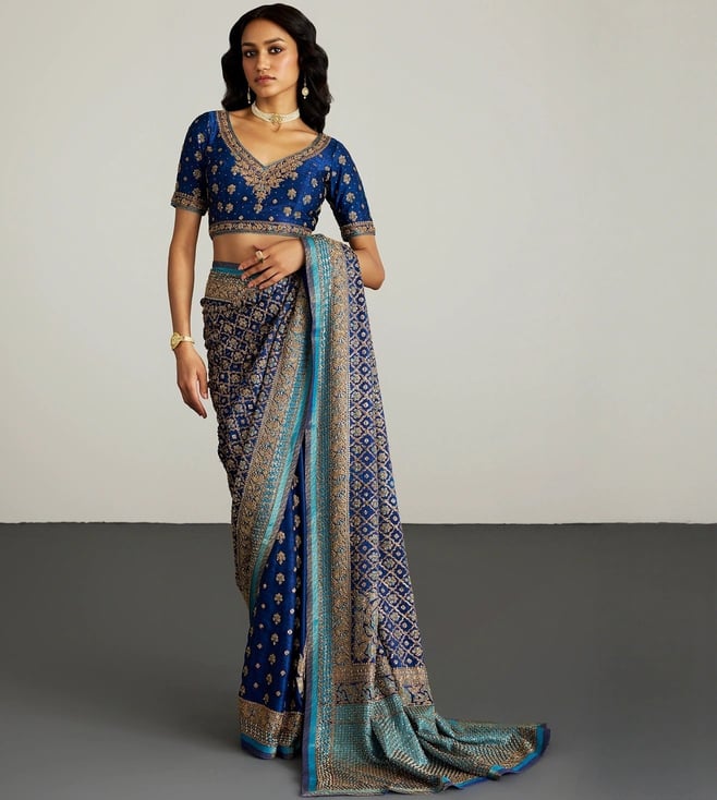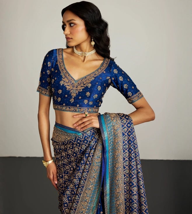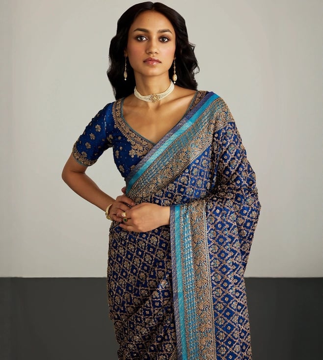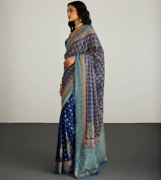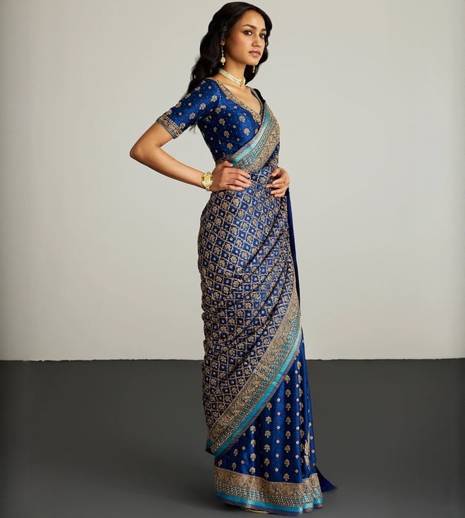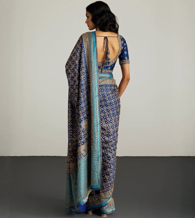 RI.Ritu Kumar Royal Blue Parampara Zardozi Saree With Unstitched Blouse