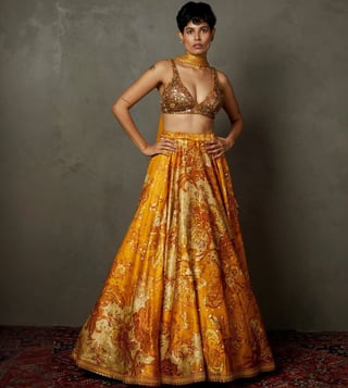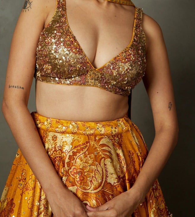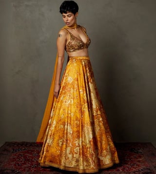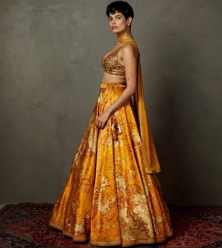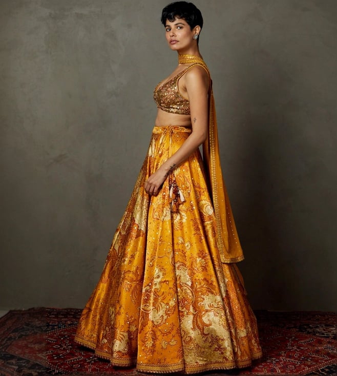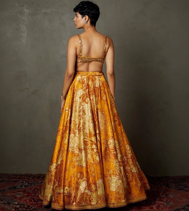 RI.Ritu Kumar Yellow & Ochre Kumar Kylie Floral Embroidered Lehenga with Blouse and Dupatta