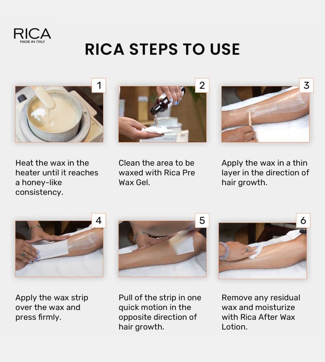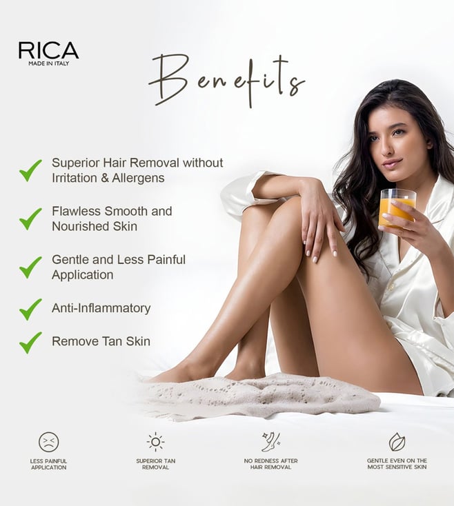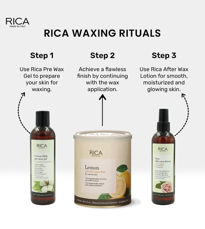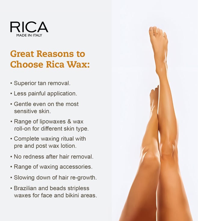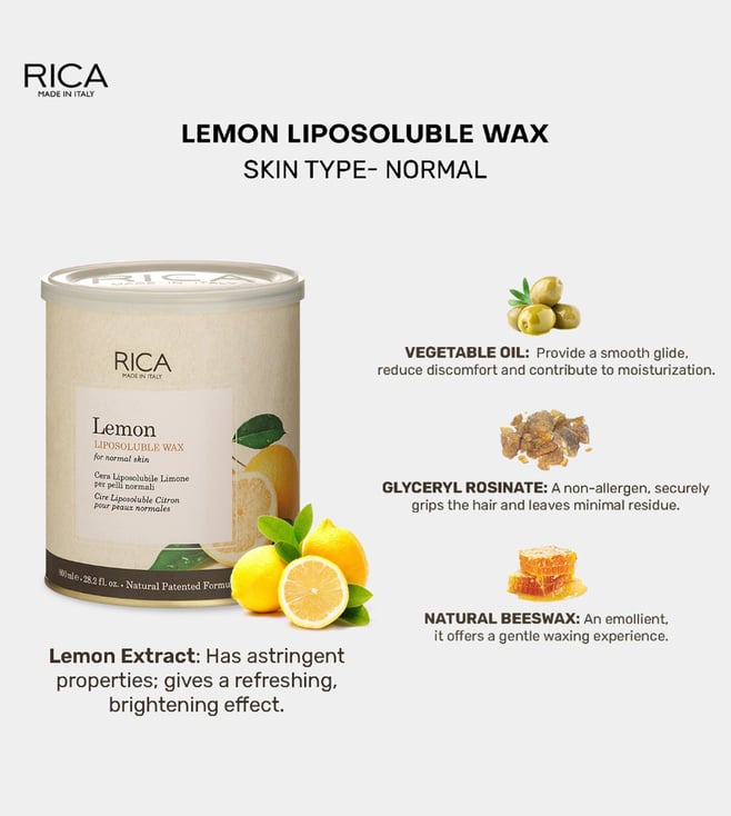 This lemon wax from Rica is suitable for even the most sensitive skin. It is known for its antioxidant properties, natural essential oil of lemon to promote rapid recovery of the skin after depilation. It is a strip wax. It is accomplished by spreading a wax combination thinly over the skin. A cloth or paper strip is then pressed on the top and ripped off with a quick movement against the direction of hair growth. This removes the wax along with the hair. It guarantees superior hair removal without irritation and allergens. It does not contain any petroleum derivatives.