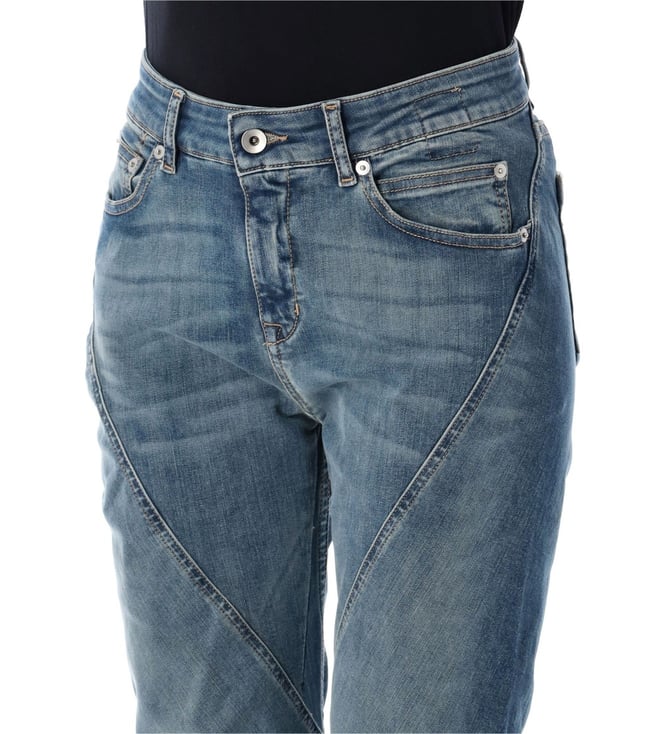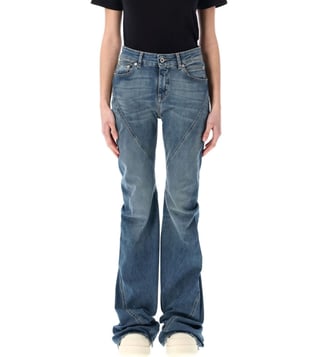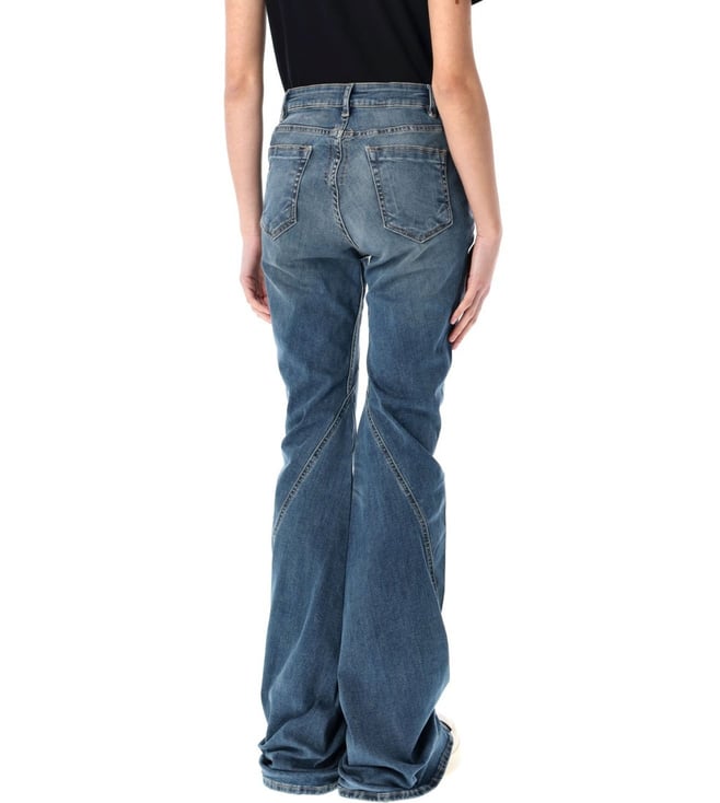 Elevate your wardrobe with the Rick Owens Blue Bootcut Fit Jeans. Designed with regular waist with a button and zipper fastening. three slip pockets on the front. two slash pockets on the bottom. flared leg. stone washed denim. these trousers combine comfort and sophistication for everyday wear.