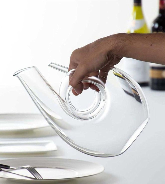 The set of 1 Curly decanter from RIEDEL helps to charge and aerate wine. The twists of the decanter form a soft and playful spiral, with a slim tail for decoration and a wider spout for easy pouring. This decanter has been handmade, meaning each piece is slightly unique. This decanter is designed to hold a single bottle of wine. It's designed for specific fillings - 0.75 l for regular, 1.5 l for magnum and 3 l for double magnum. It has a capacity of 1400 ml.