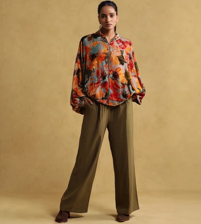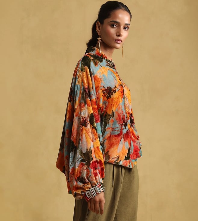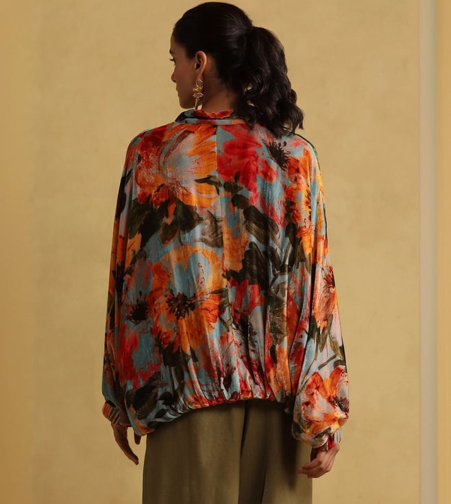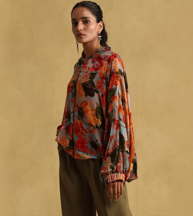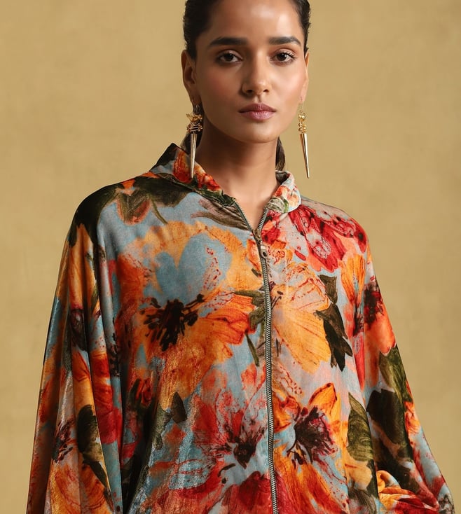 Conquer the world in style by wearing this floral print jacket. Crafted using perfection with silk velvet, it is a soothing and trendy choice. Disclaimer: All other items in the image are only for display purposes and will not be a part of the delivery content. Product colour may slightly vary due to photographic lighting sources. Country of Origin - India.