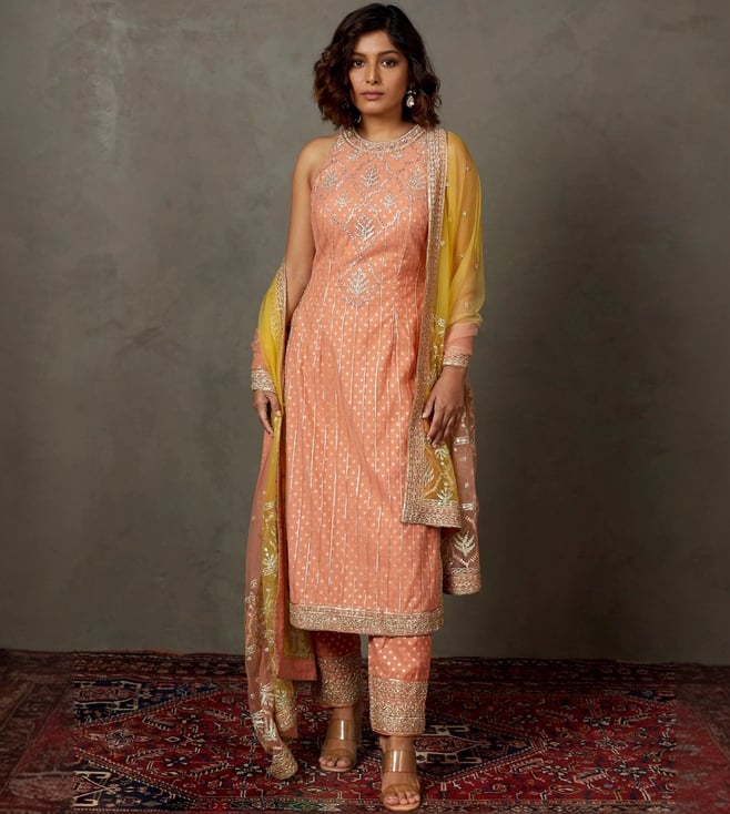 Coral Yellow Machine and Hand Embellished Sterling Kurta with Pant and Dupatta