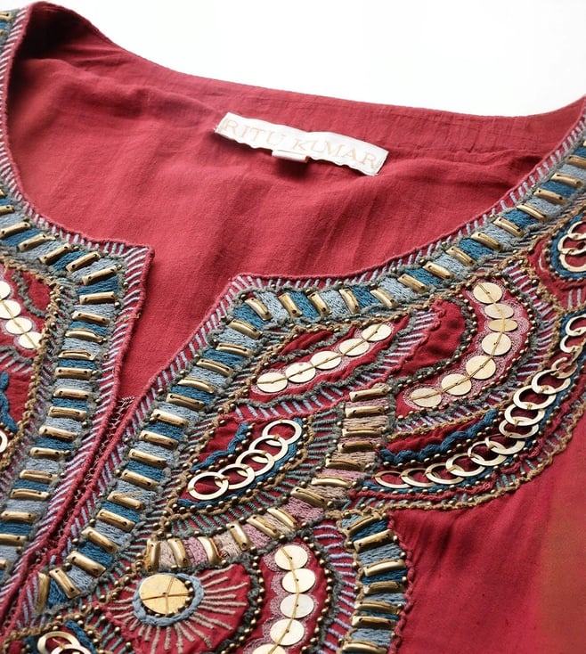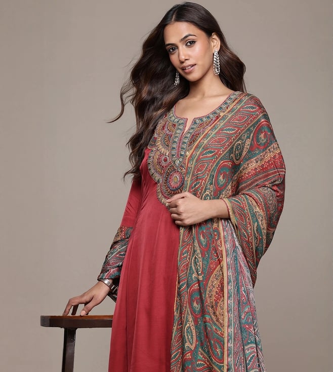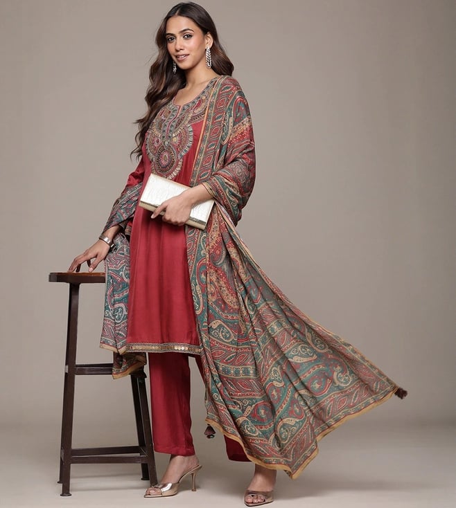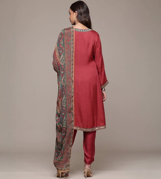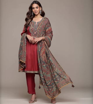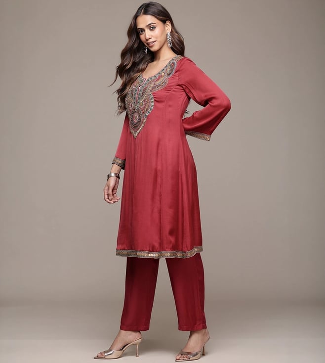 Make a bold statement with the Ritu Kumar Red Yale Kurta With Pant And Dupatta. This three-piece set features a vibrant red kurta with elegant detailing, paired with tailored pants and a complementing dupatta. Crafted from premium fabric, it ensures comfort and durability. The Yale design combines traditional artistry with modern flair, ideal for festive gatherings or formal occasions. This ensemble radiates sophistication and cultural elegance.