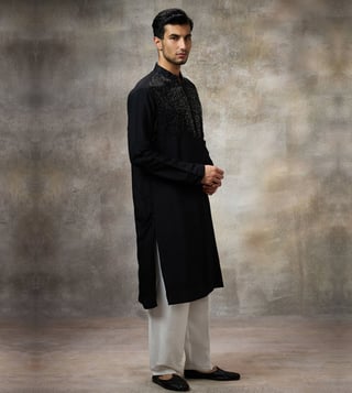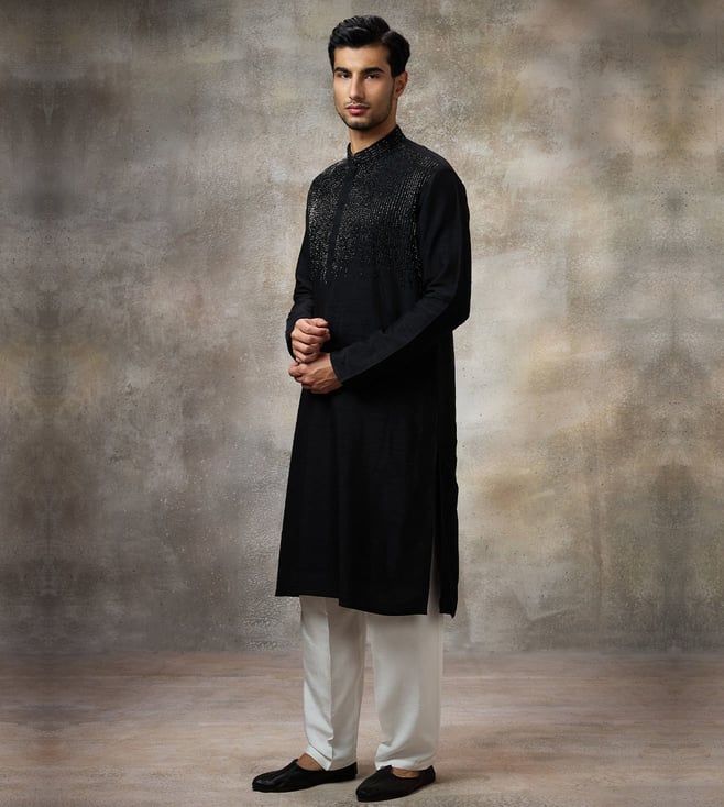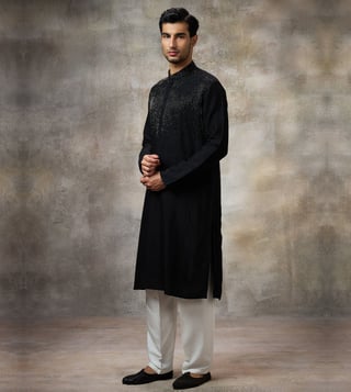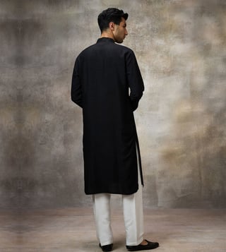This stylish kurta and pants set includes a black kurta with a high collar, front placket, and detailed embroidery on the upper part for a unique look. It also has pockets for convenience. The straight-cut white pants feature drawstrings that offer various styling options. Keep your look fresh with a simple bracelet or ring for understated elegance