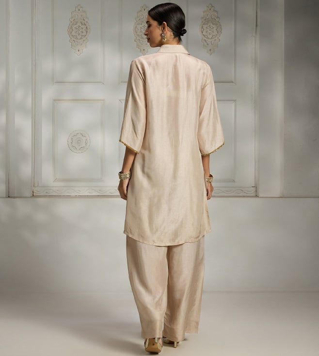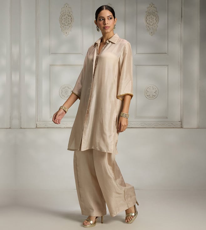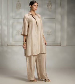 This clothing line is characterized by a variety of appealing, intricate designs. The collection includes lovely light-colored, long-sleeved tunics with gold embroidery on the placket and the cuffs. exclusive trousers will elevate y casual look to the next level with chic fl.