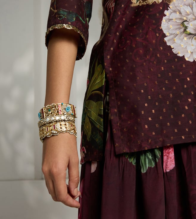 This tunic features antique embellishments at the V-neckline, giving it an intricate aesthetic. This intricacy is further enhanced by the color, pattern, and signature print, resulting in a unique vintage look. Pair it with exclusive trousers to achieve the perfect blend of style and comfort.