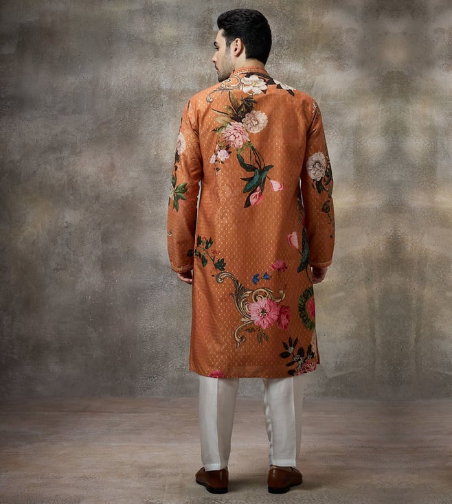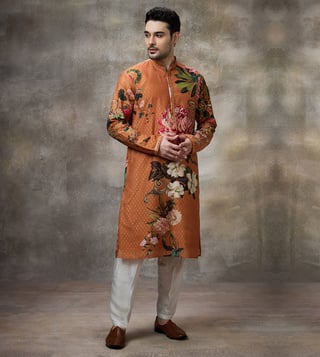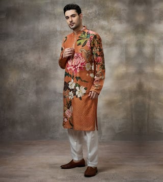 The kurta is a lovely rust color with a signature floral print. It features a high collar and a buttoned placket. The collar and cuffs we trimmed with lace, and the kurta includes pockets. The matching white pants have straight cuts and a drawstring waistband. Keep your look fresh with a simple yet stylish bracelet or ring for understated elegance