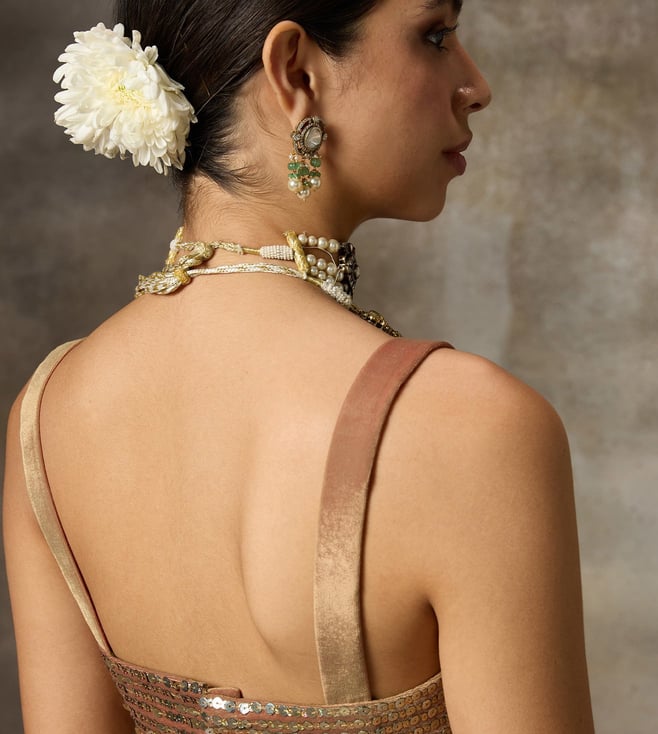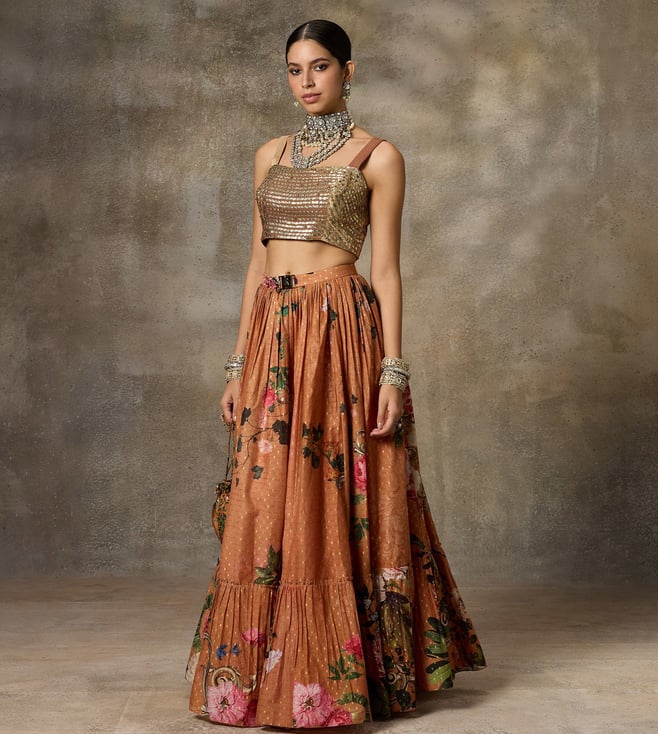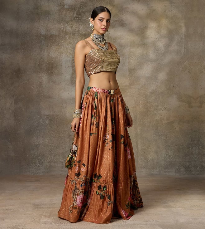 Turn heads in the Rivaar By Rocky Star Rust Floral Printed Regular Fit Lehenga Set. This elegant ensemble features a square-neck blouse with delicate straps, embellished with shimmering gold sequins for a touch of opulence. The high-waisted skirt is beautifully gathered, adding volume and graceful movement to your look. Designed for both comfort and impact, this set is perfect for festive celebrations or special occasions. Complete your outfit with a luxe clutch to enhance the glamour and make a striking style statement with ease.