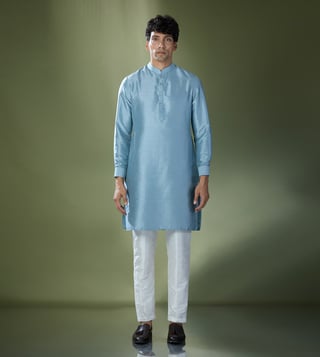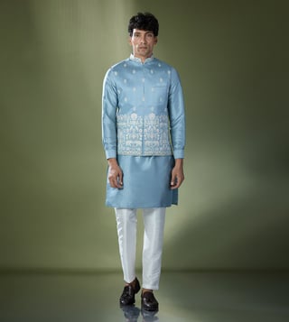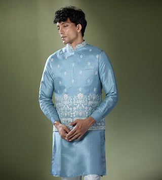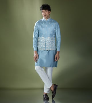 Elevate your festive style with the RNG Safawala Blue Kurta Set. Crafted from premium raw, cotton, and dupion silk, this sleeveless ensemble includes a stylish jacket for a complete look.