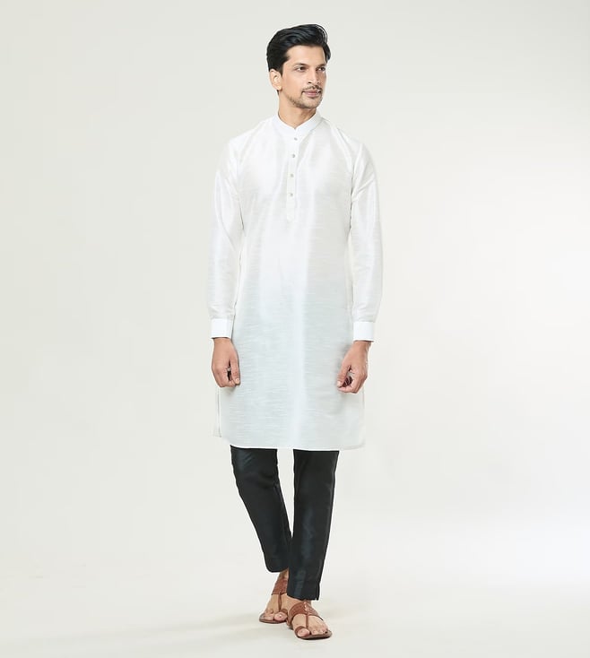 Elevate your festive wardrobe with the RNG Safawala Off White Regular Fit Kurta Set featuring a stylish jacket. Crafted from luxurious raw silk and perfect for men.