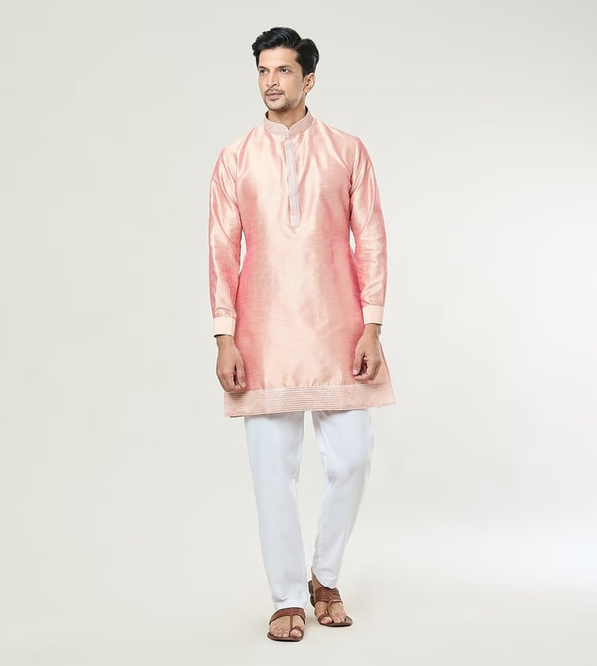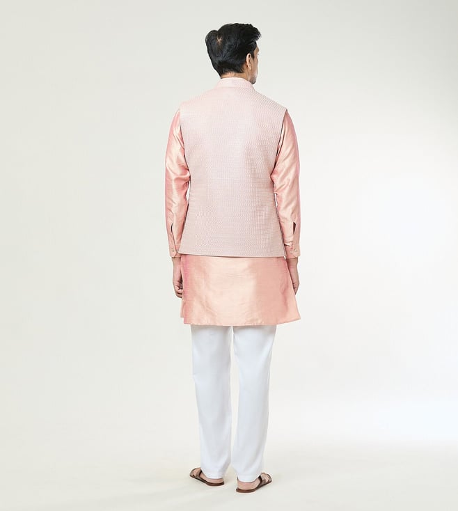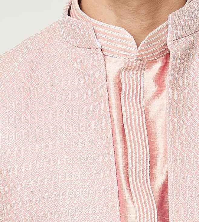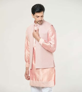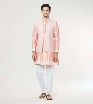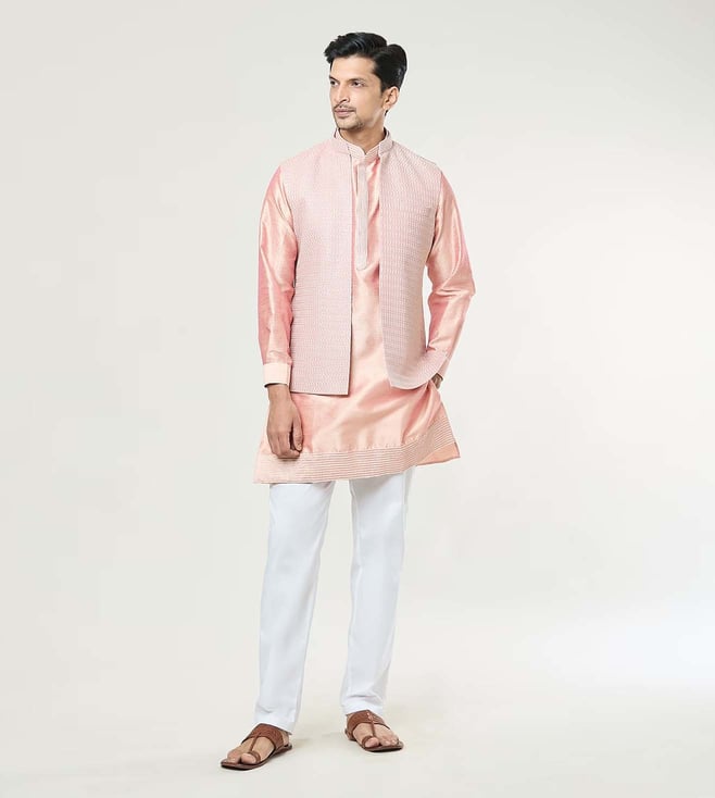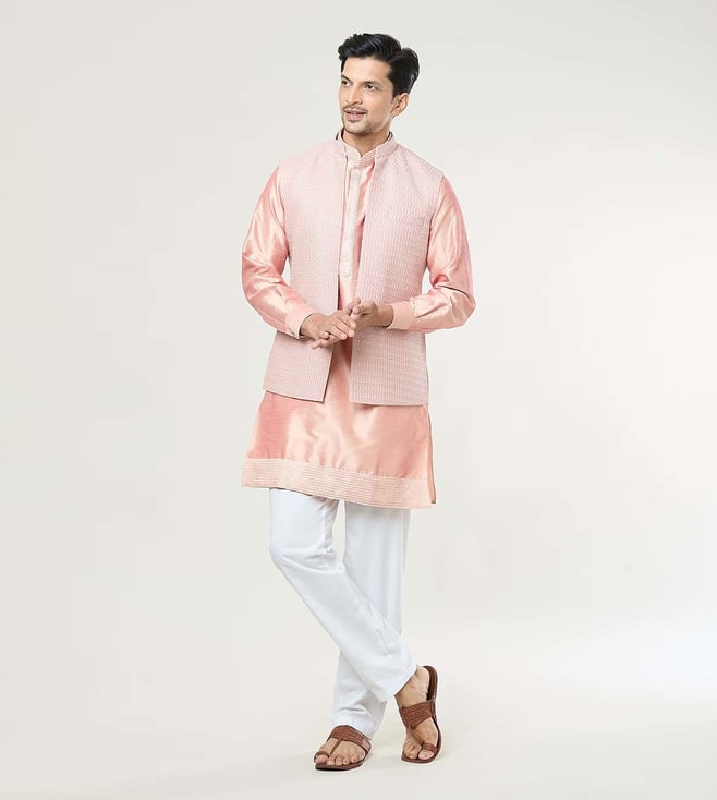 Discover elegance with the RNG Safawala Peach Regular Fit Kurta Set for men, featuring a stunning jacket. Perfect for festive occasions, crafted from Georgette, Cotton Silk, and Dupion Silk.