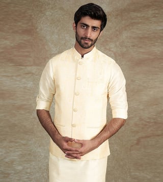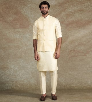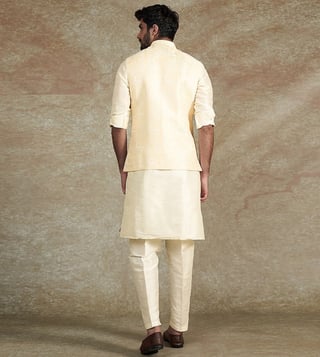 Cast a refreshing charm on the onlookers with this kurta and jacket set. The self-designed jacket is paired with churidar pyjamas. This garment from the Ruhaniyat collection has been crafted with care using jacquard, dupion silk. Disclaimer: Product colour may slightly vary due to photographic lighting sources. Country of Origin - India.