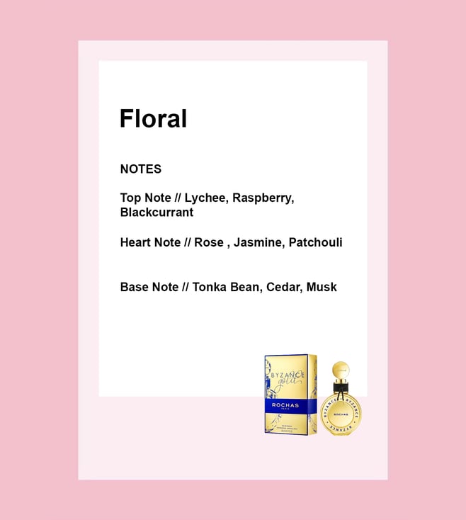 Byzance Gold is a reenchanted version that subtly blends the modern fairy tale with stories from the thousand-and-one nights. This rich, luminous fragrance is a flamboyant fruity, floral, chypre. The head opens with a parade of raspberry, lychee and blackcurrant notes. The radiant floral heart of rose and jasmine is offset by potent, majestic patchouli. In the base, luxurious notes of tonka bean, cedarwood and musks add a hint of magic.
