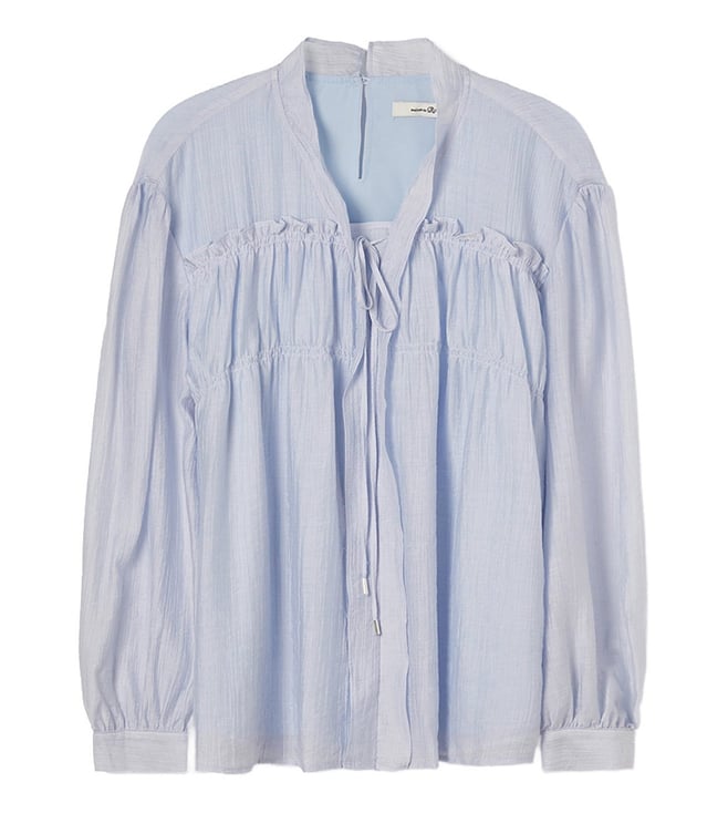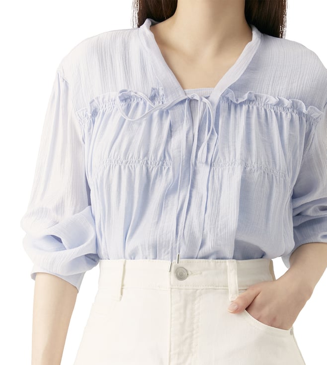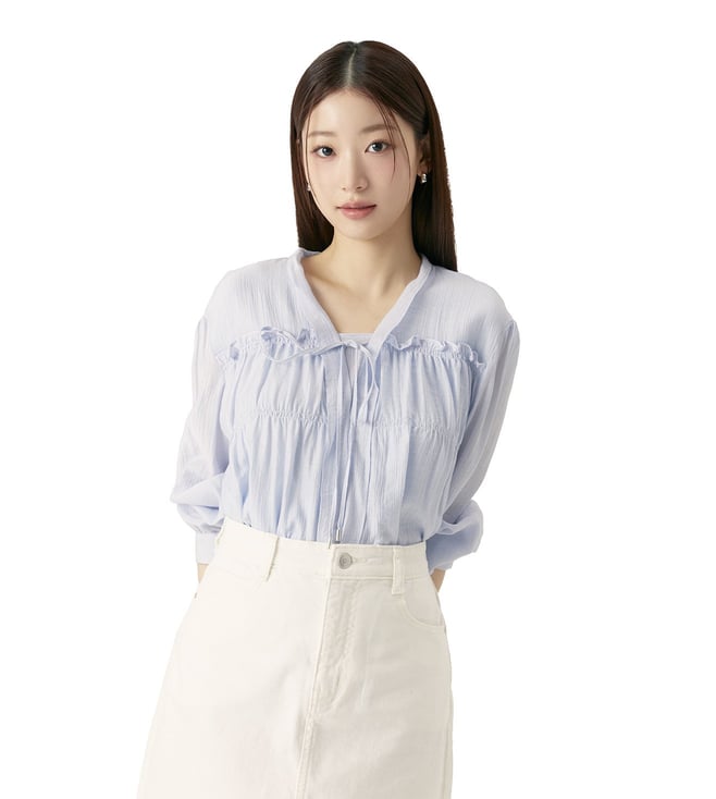 Elevate your everyday look with the Roem blue frill regular fit top. Crafted from comfortable polyester, this top features long sleeves, a flattering v-neckline, and a stylish frill detail. Perfect for daily wear, this top effortlessly combines style and comfort. Whether you aree heading to the office or meeting friends for brunch, this versatile top will keep you looking and feeling great all day long. Upgrade your wardrobe with this must-have piece that will seamlessly take you from day to night.