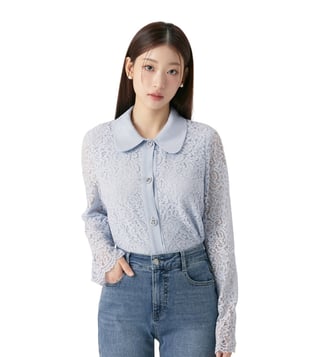 Elevate your wardrobe with the Roem Light Blue Lace Embroidered Regular Fit Shirt. This stunning shirt combines classic sophistication with a touch of feminine charm, thanks to delicate lace detailing. The regular fit ensures comfort and versatility, perfect for both work and play. Stand out from the crowd in this effortlessly elegant piece that will take you from day to night with ease. Add a touch of romance to your look with the Roem Light Blue Lace Embroidered Regular Fit Shirt.